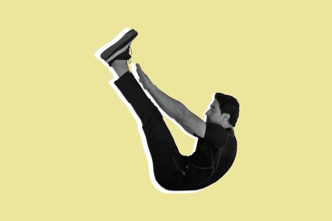 Start by sitting in a crunch position — but, rather than having your feet on the floor, bring the soles of your feet together and push your knees to the floor. Reach upwards in a crunch to touch your toes and return to your start position.