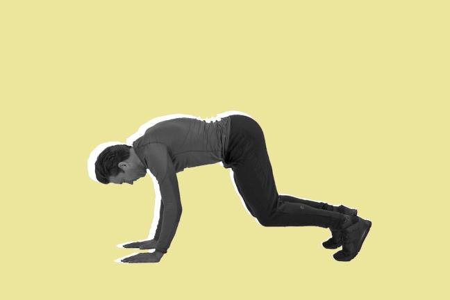 For this final exercise, start on all fours with your hands parallel to your shoulders. Raise your knees an inch from the floor, while keeping a 90-degree-angle between your knees and toes. Tuck your chin inwards to look towards your belly-button and hold this position.