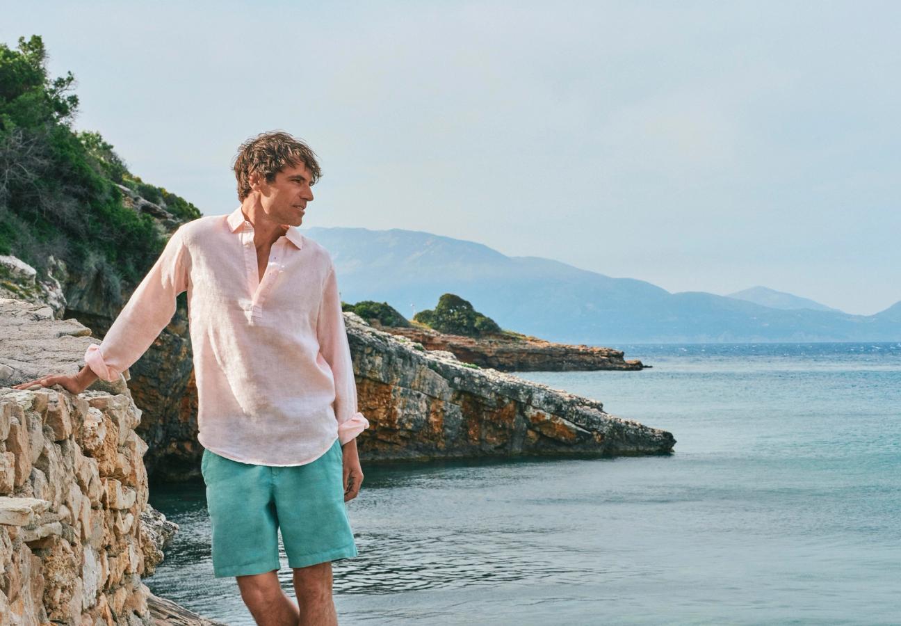 Straddling the line between dressed-up and off-duty is the Hoffman Linen Shirt, whose collar provides a formal slant, while its four-button placket evokes one that is often featured on a polo. It also arrives in a timeless white colourway, meaning it can be paired with most pieces, and a pastel-pink option offers a colourful alternative with a soft touch. Equally, if you prefer a completely buttoned-up look, there’s the Abaco Linen Shirt, which has an evening-time feel and is available in a slew of sun-friendly colours – ‘limoncello’ and ‘golden hour’ among them. Meanwhile, for those who favour a short sleeve, the Go With the Flow Arawak Linen Shirt showcases a pattern of Moorish idol fish that’s set on a deep-blue base, the effect of which creates a wave pattern.