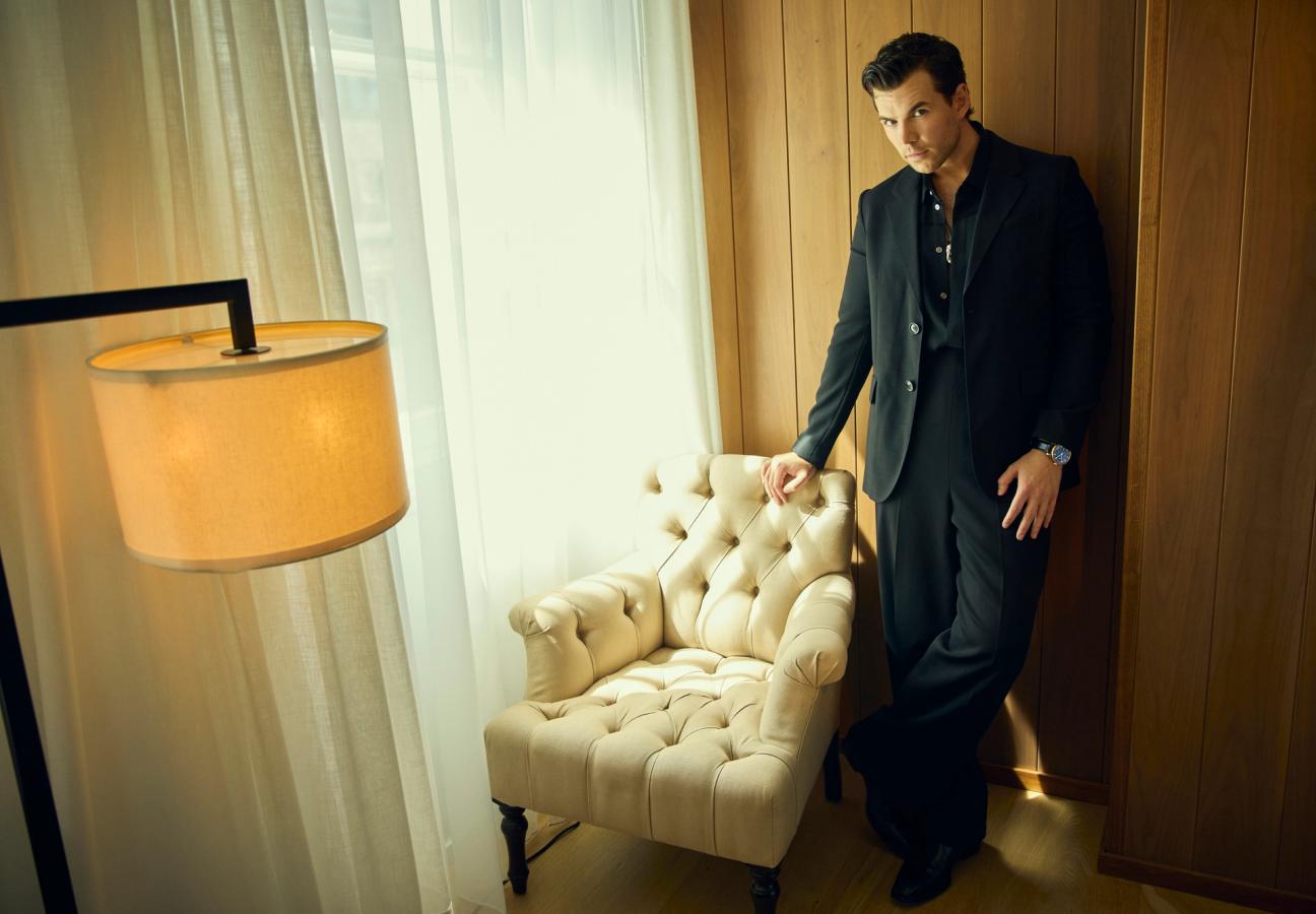 Eventually they settled on a suit from contemporary Parisian label AMI, serving up a mighty dose of Gallic cool. “I’ve been a big fan of the designer Alexandre Mattiussi’s work for a long time - I wore one of his looks for one leg of the Bridgerton press tour in Australia, and have been to his shows.” The suit in question consists of a black single breasted jacket and a pair of high-waisted, wide-legged trousers, as well as a sleeveless, grandad-collared under layer. on his feet he wore Manolo Blahnik shoes.