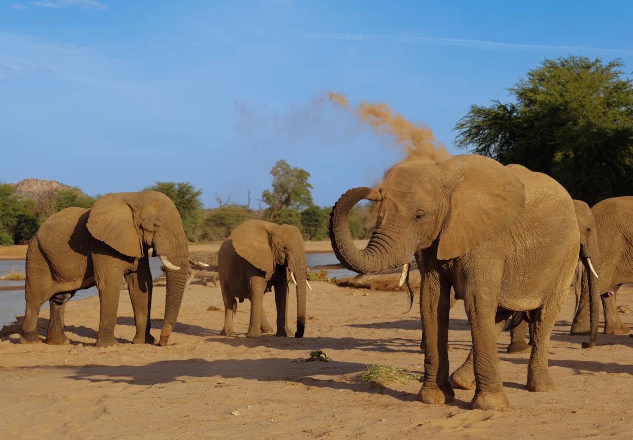 My hosts, and proud owners of Sasaab, Tanya and Mikey Carr-Hartley, founded the Safari Collection, a group of luxury camps and lodges in some of the most beautiful locations in Kenya, where sustainability and conservation are at the forefront of the agenda. They softly explain how after years of being protected, studied, and respected in this region, “the elephants have become accustomed to humans and no longer perceive us as a threat.” As the alpha male towers over our canvas-covered Land Cruiser, he sizes us up. Thick white tusks emanate from his giant head, as broad as the vehicle itself. He calmly accepts our presence and turns his attention towards the herd.