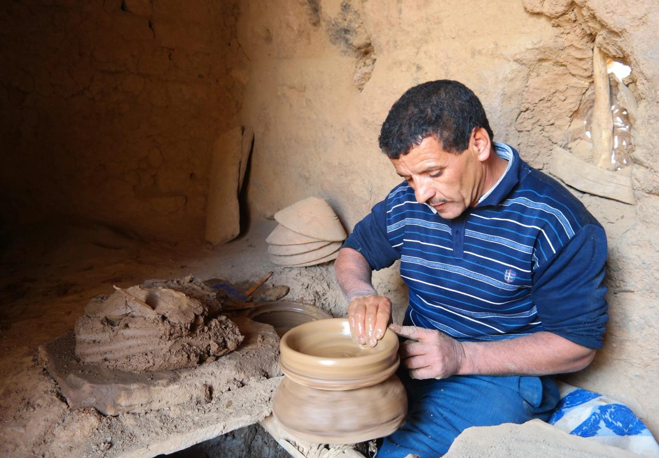 One day later and my wish is about to be granted. As I carry the simmering tagine back to the family table, I become distracted by the craftsmanship of the pot. Substantially designed and delicately decorated, it was spun into creation by Fatima’s son, Hassan. As the village potter for more than two decades, Hassan’s signature earthenware pots line the dirt streets, drying out in the sun before being further baked in a kiln.