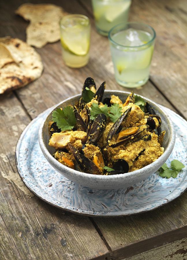 “This is my updated take on the traditional Goan Fish Curry, with a slightly tangier taste and a thicker sauce consistency,” says Bowlby. “You can use any firm white fish or shellfish you like, but here we find hake holds its shape rather well and the mussels are strong enough to take on the robust flavours of the sauce. If you prefer a runnier sauce, just add water or fish stock.”