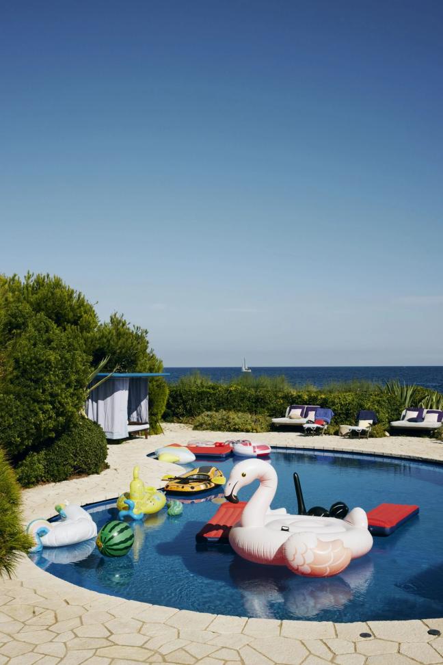 The second is shaped like a kidney bean, and is beamed directly from the denouement party scene of a 1970s Beverly Hills romp. It has its own coffee table book and apparently its own gravitational pull — a quick flick through the former reveals Naomi Campbell alongside Woody Allen; Michael Douglas next to Jack Dorsey; Cindy Crawford and Charles Saatchi splashing among the oversized inflatables. The awnings around the pool’s edge, meanwhile, are coloured bright orange (as opposed to the ubiquitous Riviera blue), because Pigozzi heard from designer Ettore Sosstass who got it from a fishmonger in Sicily who got it, presumably, from a particularly vain lobster, that all seafood looks better and fresher under a sunset orange glow — and so all people must do, too. (“There’s no fish here,” he smiles. “But some of the people who come over look like fish…”)