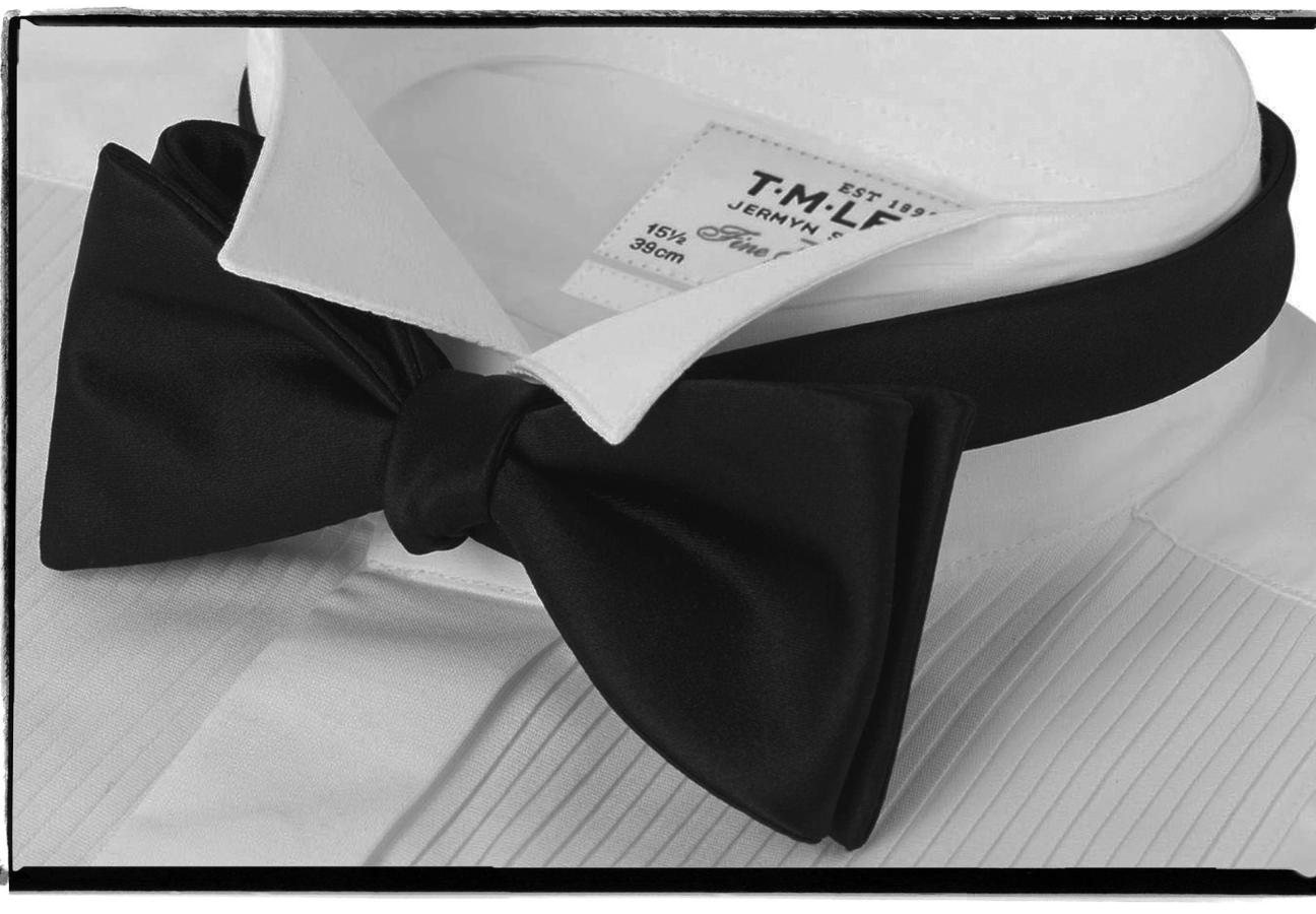 Unless they grab you by the lapels and lean in to inspect it, no-one will be able to guess the thread-count of your bow tie on sight. So don’t bother investing more on your neckwear than you need to. Instead, stick to classic silk or satin — nobody needs a velvet bow tie — and wow your fellow guests in other ways.