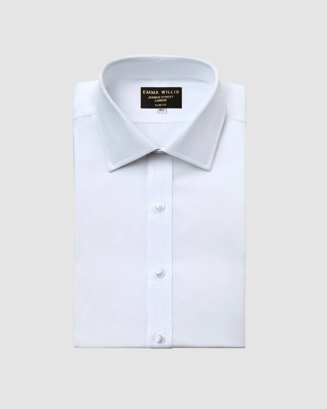 Emma Willis is renowned for its luxuriously soft cotton shirts, and this one is no different. Meticulously handcrafted in England using the finest Pima cotton, it features hand-trimmed collars, small handmade gussets at the side seams, gold engraved collar stays and real Iridescent Mother of Pearl buttons.