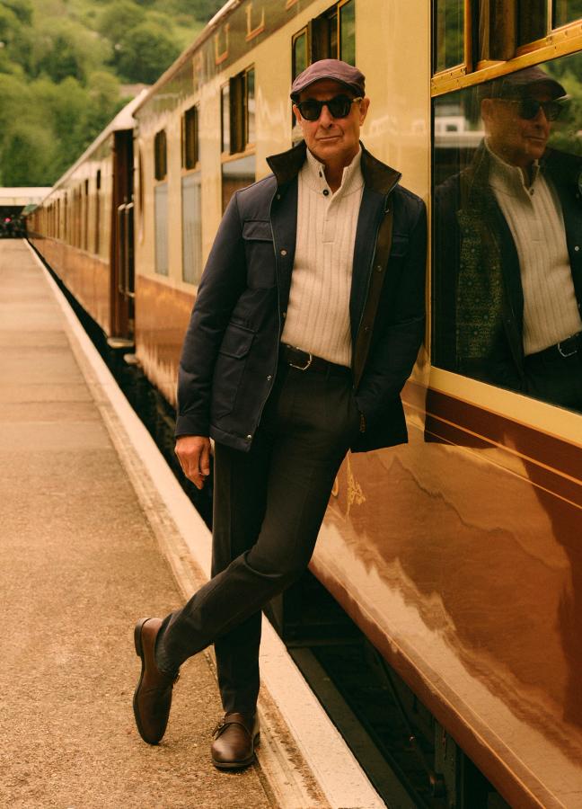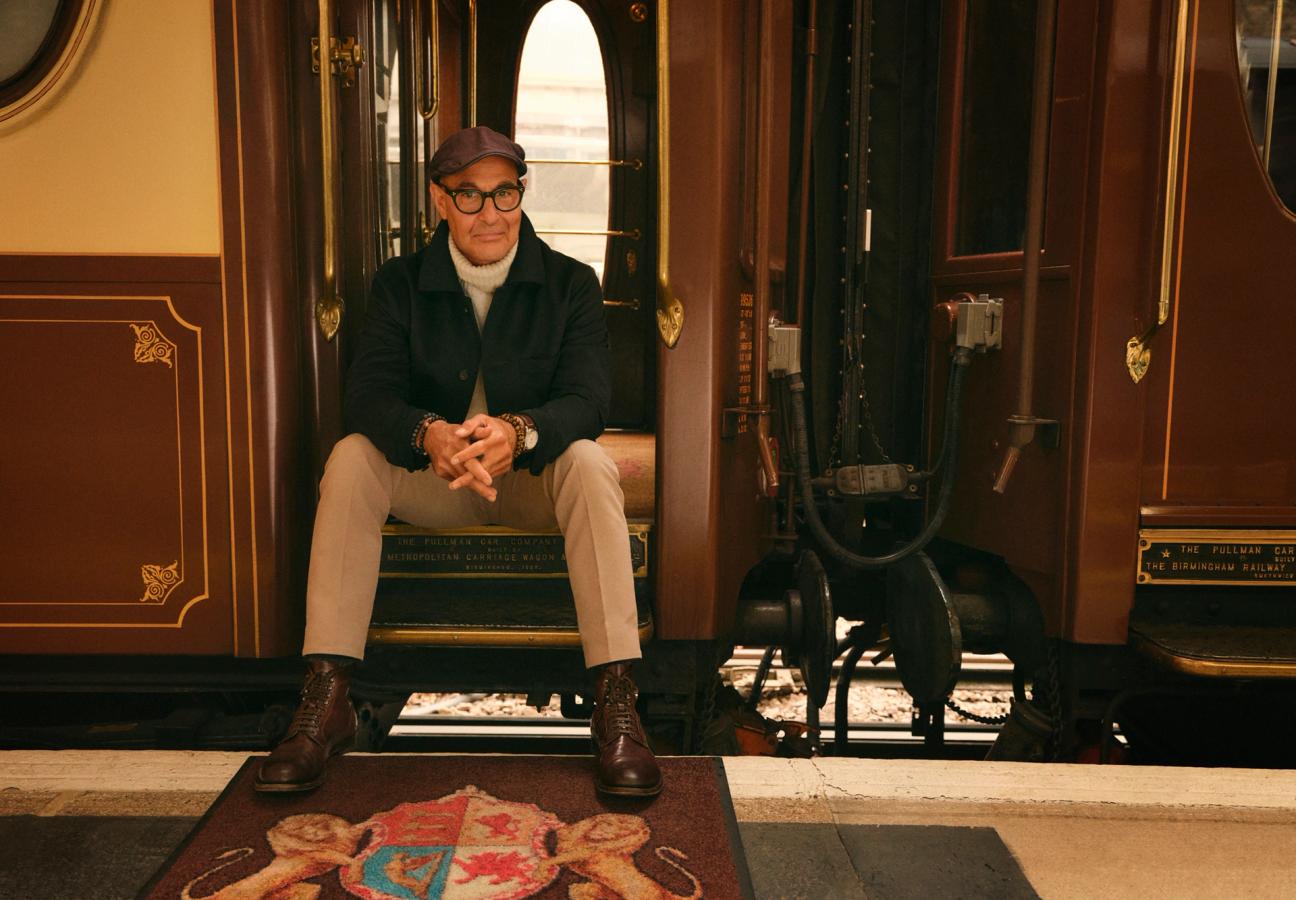 In order to showcase the resulting range, Tucci jumped aboard a sumptuous British Pullman train. Featuring the same emerald accents as his collection, the ever-elegant actor modelled the pieces himself in the luxurious carriage, channelling both his love for travel and a life well-spent in front of the camera. And, if there’s something of old cinema about the campaign, that’s no accident.