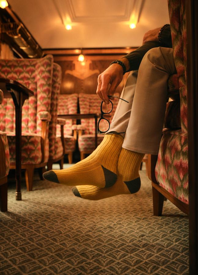 Add to the line-up a pair of jackets (both field and utility), a herringbone scarf, and a knitted tie (which, in another twist on tradition, features a pointed blade), and the capsule proves itself a perfect winter wardrobe primer. Five colourful pairs of travel-ready socks — with green, orange and ochre accents — round out the collection. And, as with every other piece, even these are exquisitely made, with an attention to detail that keen gastronomer Tucci equates to ingredients in a recipe.