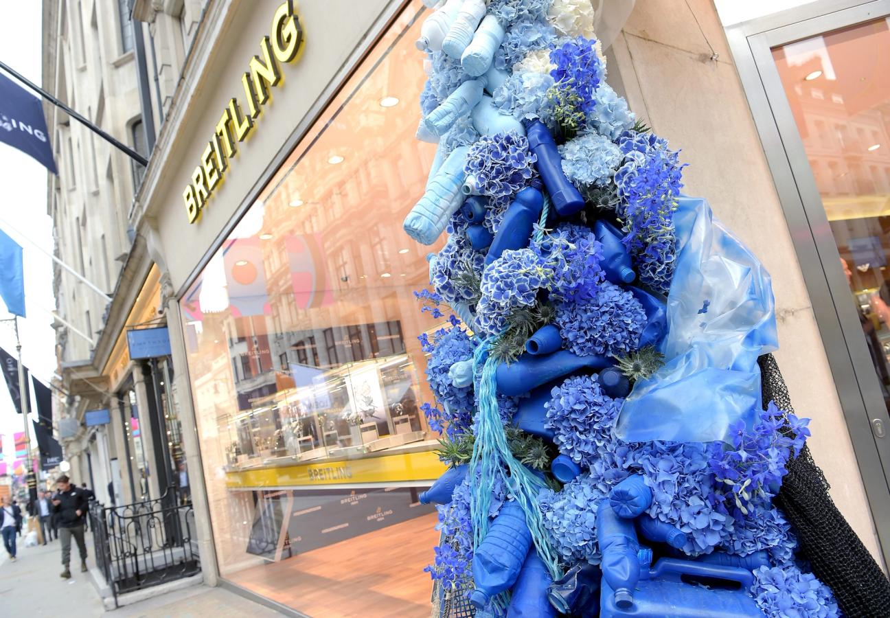 Guests including Oliver Cheshire, Dougie Poynter and Laura Whitmore entered the boutique through an installation wave made of plastic waste and netting, juxtaposed against a floral spray drawing attention to ocean pollution and the scale of waste making its way to the ocean.