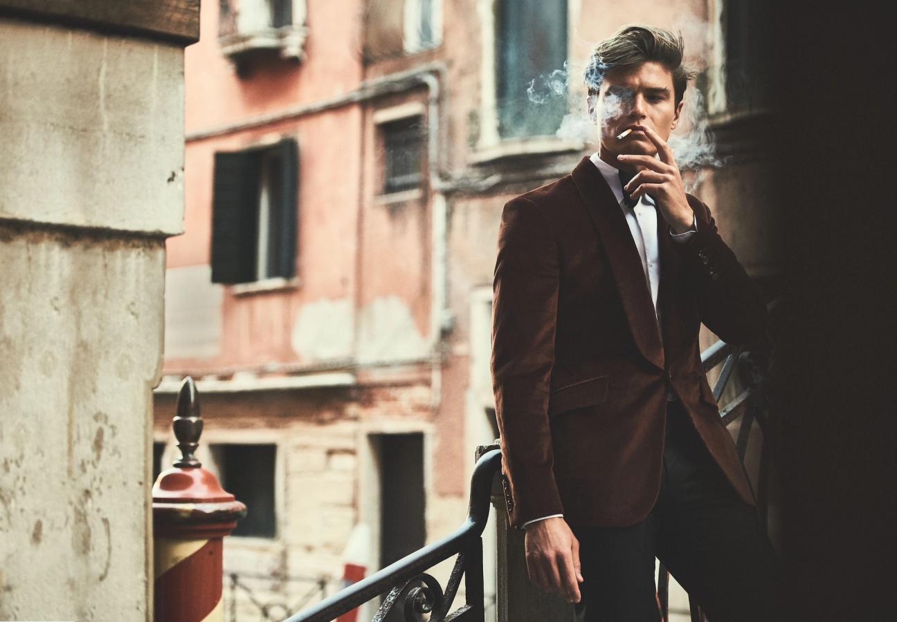 Lighting up on one on Venice’s famous bridges, Cheshire dons a velvet number from heritage British tailors, Hackett.