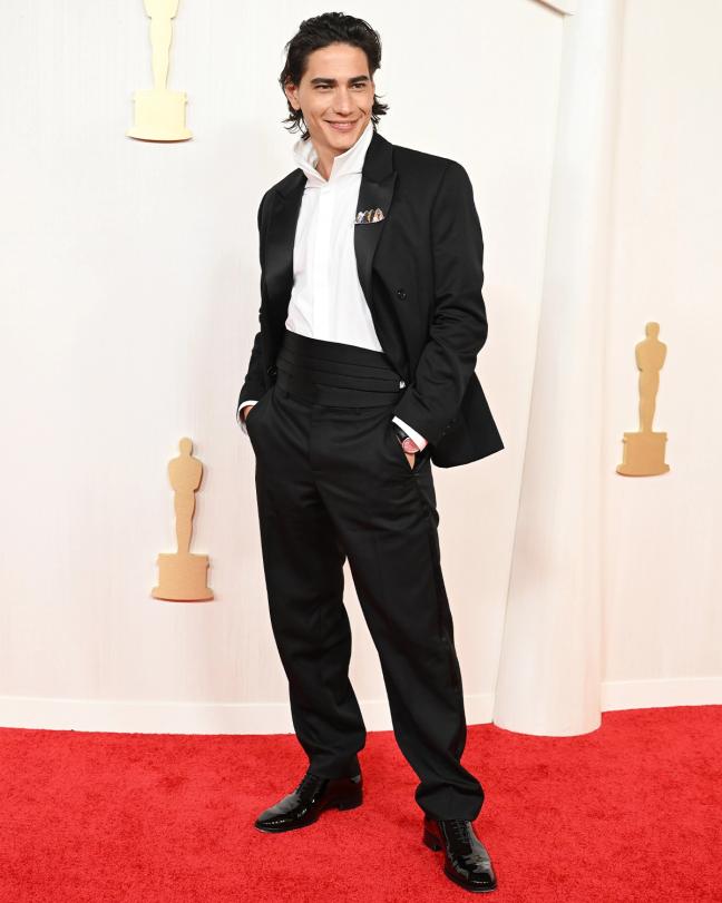 Uruguayan actor Enzo Vogrincic wore Loewe to the BAFTAs and for the Oscars, it was a similar vibe. He wore a custom Loewe double breasted tuxedo suit, which was modern in its approach to classic tailoring thanks to the upturned shirt collar.