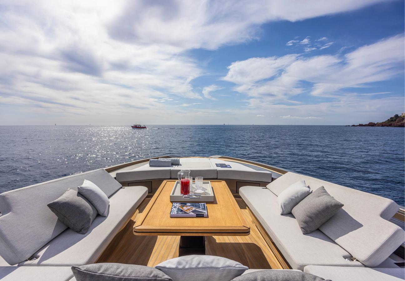 The luxurious 28-metre yacht combines comfort, space and style in equal measure, with three ensuite cabins, a lounge and an office below deck, and a large sunbathing area aft and bathing platform above deck, plus access to the kitchen, which is deliberately separated from the VIP section. Forward, a spacious dinette with relaxation and dining area are easily accessible thanks to the generous and comfortable side walkways.