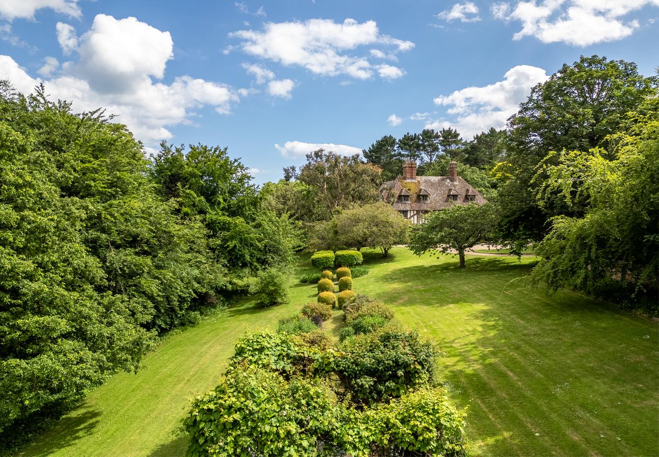 As impressive as the interiors are, the grounds are equally captivating. Set within approximately seven acres, the gardens are approached via a sweeping lime tree-lined driveway and are rumoured to reflect the influence of Gertrude Jekyll. Naturalistic planting, herbaceous borders and year-round colour define the landscape, while a wide south-facing terrace extends from the drawing room, overlooking formal lawns and a central water feature. Mature woodland and yew hedging offer privacy and shelter, and a wisteria-covered rear façade adds seasonal charm.