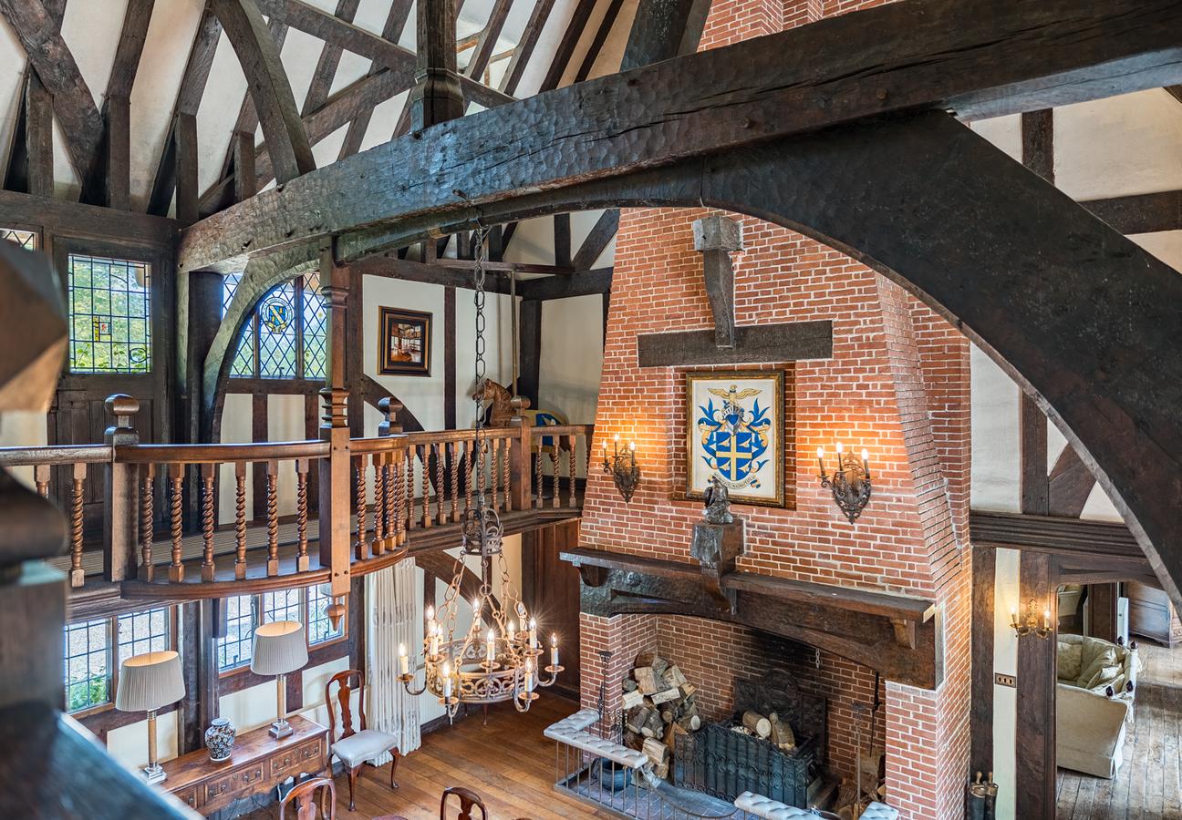 At the heart of the property lies the exceptional full-height great hall, flooded with natural light and framed by a dramatic timber truss. This striking space is overlooked by a galleried landing, complete with a central chandelier, creating a setting perfectly suited to both entertaining and quiet admiration.