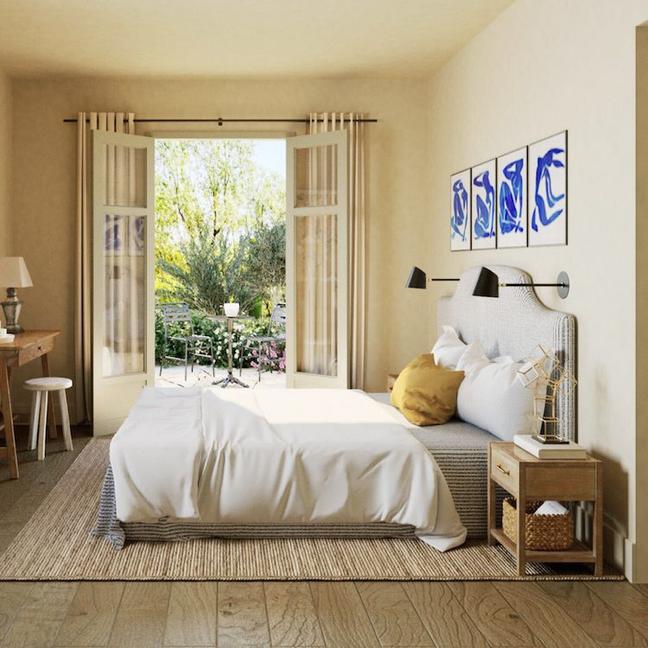 Move back inside the house, and you’ll discover a generous dining room, living room with log-burning fireplace and a master bedroom complete with ensuite. And all of these welcoming spaces are bathed in the same soft, sun-kissed terracotta tones — deftly accentuated with weathered stone, ceramics and woods.
