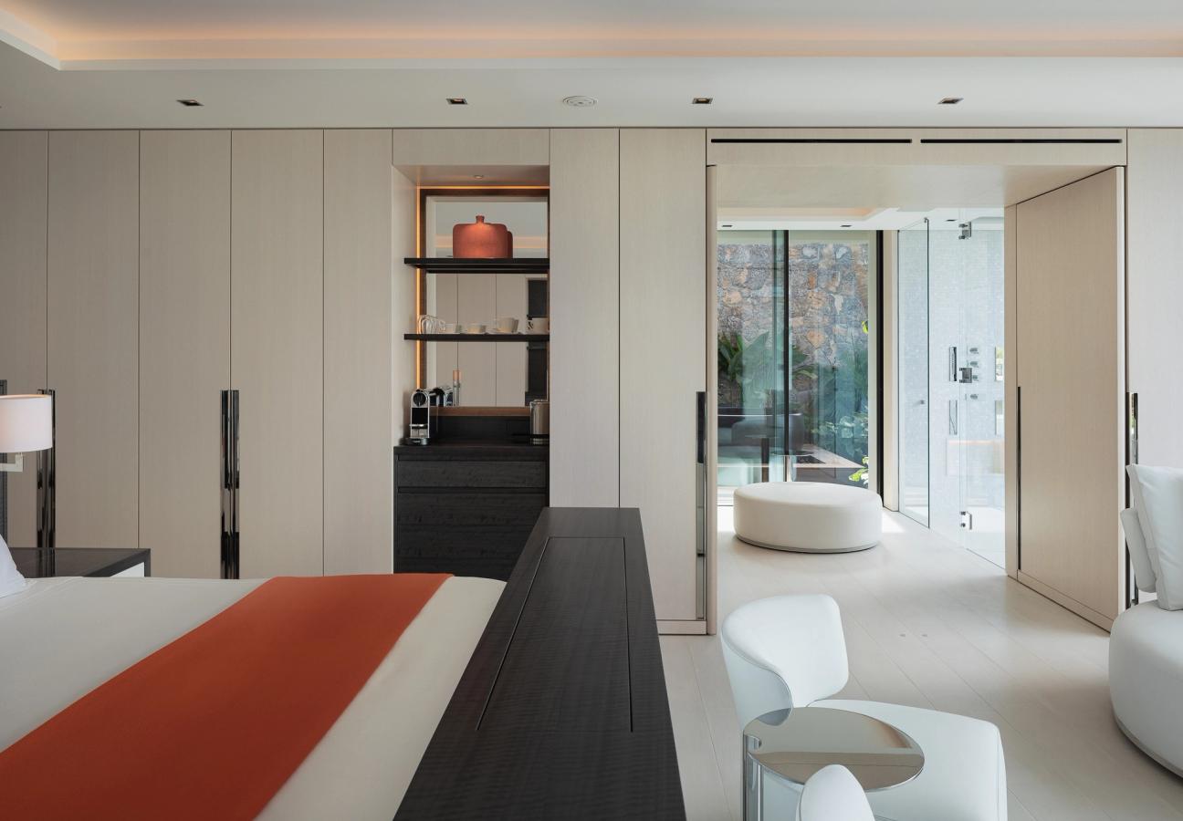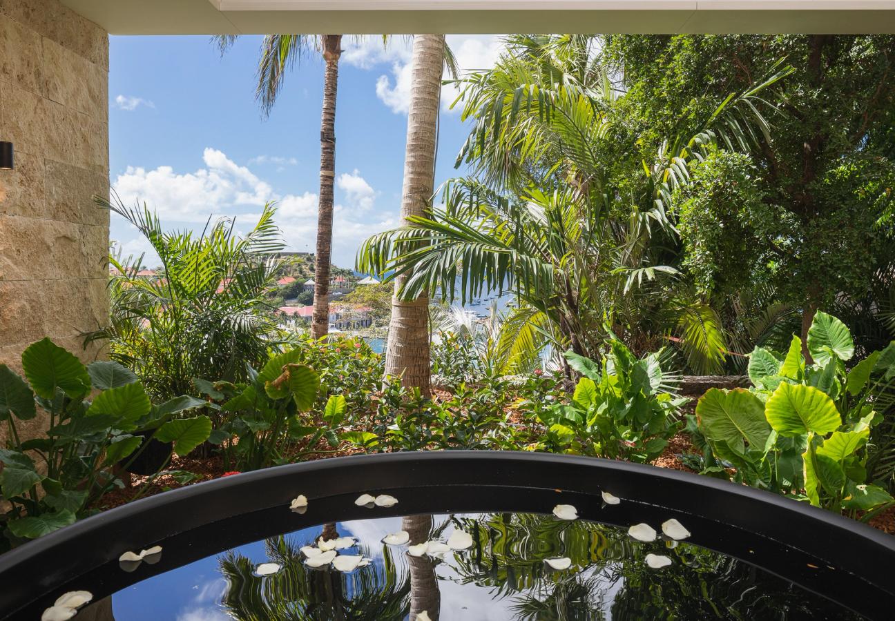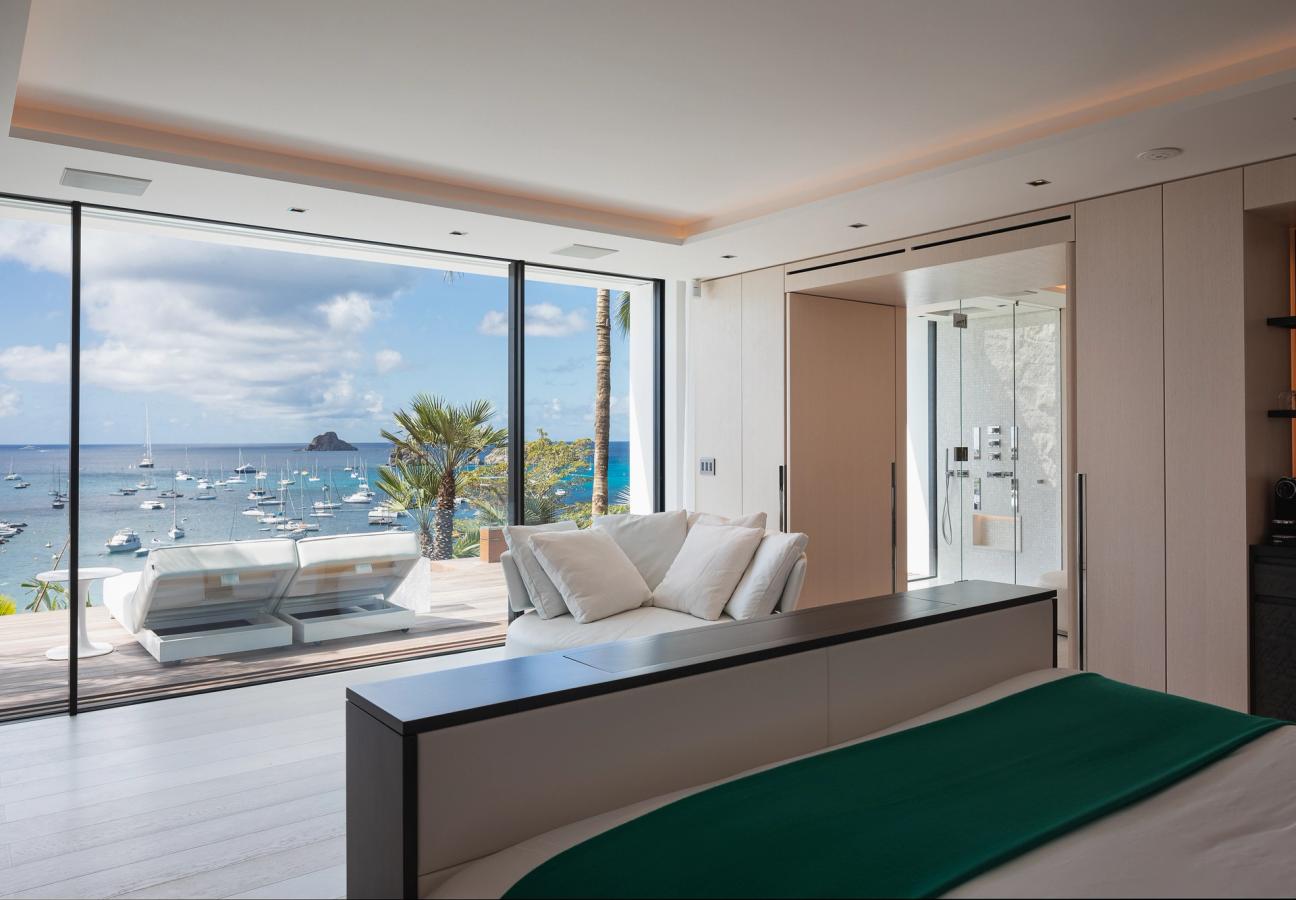 The villa’s five expansive suites are each a private sanctuary with its own personality, from the Gustavia Suite with its private drive-up entrance, onyx and mother of pearl headboard and bespoke armchairs, to the Gouverneur Suite, which features an outdoor Japanese soaking tub and floating king bed. All suites come with a private garden, retractable 49-inch television, indoor and outdoor shower, private terraces, and stunning sea views.