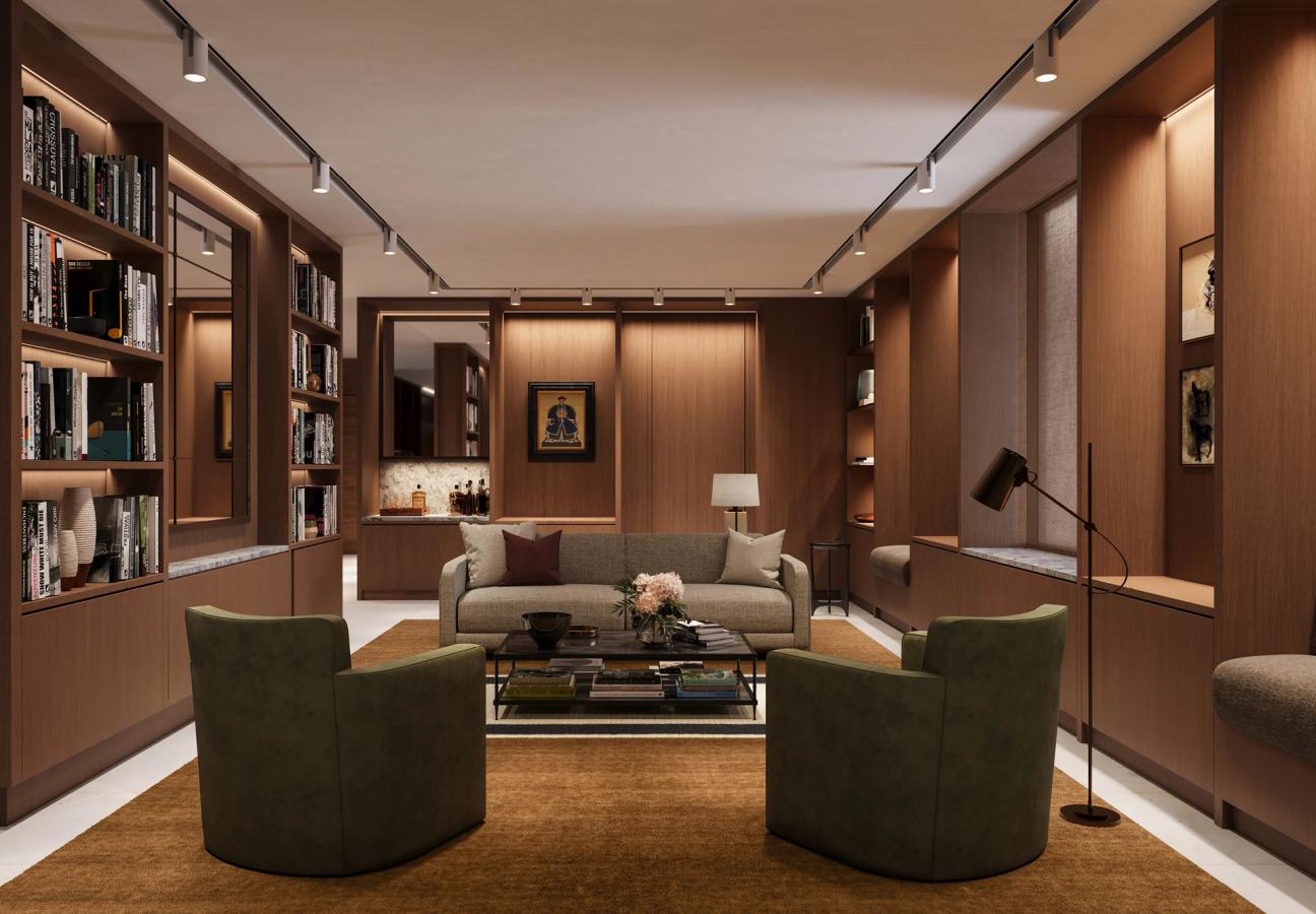 All residences feature Silver Travertine bathrooms and Grey Quartzite kitchen worktops with sawn oak veneer joinery and Miele appliances, with most apartments featuring an Arabescato marble fireplace. Holistic wellbeing is at the core of the 100 George Street experience: In addition to a discreet 24-hour concierge and security, residents have access to a carefully considered suite of social spaces, also designed by Chapman Eugène. These comprise a state-of-the-art fitness studio, treatment room and sauna, library, residents’ lounge and meeting room.