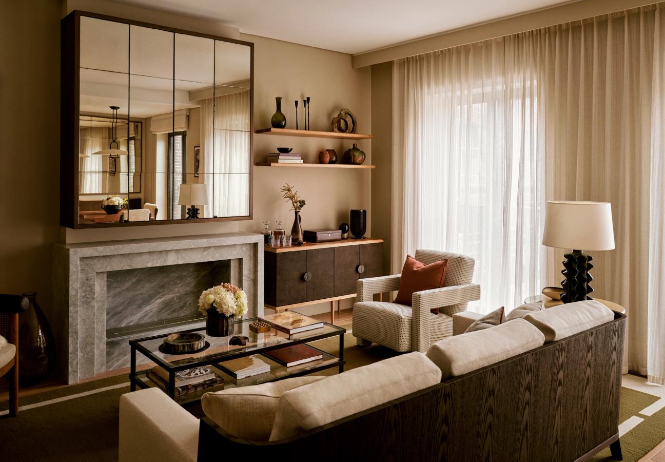 The first show apartment in the Hopkins Architects-designed building was recently unveiled by globally renowned developer Native Land. The two-bedroom, 1,157 sq ft apartment is dressed by London-based interior design studio Chapman Eugène, whose calm and considered design is translated through shaded tones, gentle colours and the layering of natural materials and textures. These neutrals allow for statement furniture pieces and characterful art to add distinct personality – from a custom-made dining table made using locally sourced marble to dramatic photographs by London-based photographer Stuart Redler.