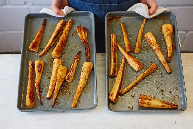 1. Peel parsnips, remove top and tail, cut into quarters (length-ways), remove the root and cut in half again.