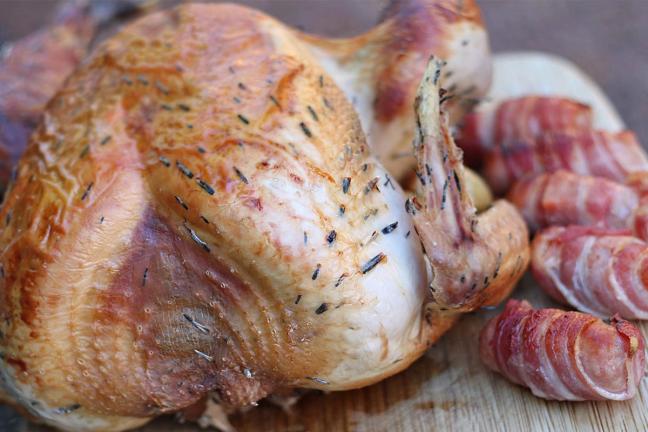 12. Place in the oven at 220C for ten minutes just to get it brown. After ten minutes, take it out, baste it and place strips of bacon on top (horizontally)