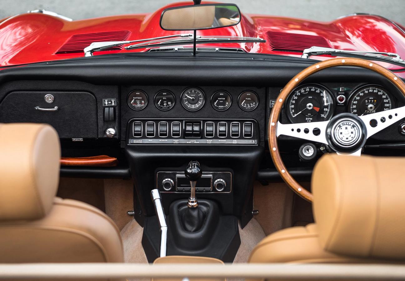 Underneath the one-piece clam-shell bonnet lies the E-Type’s original 5.3-liter V12 engine, fully restored with electronic fuel injection and a mighty fine 5-speed manual transmission.
