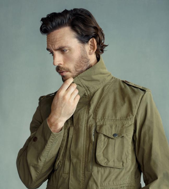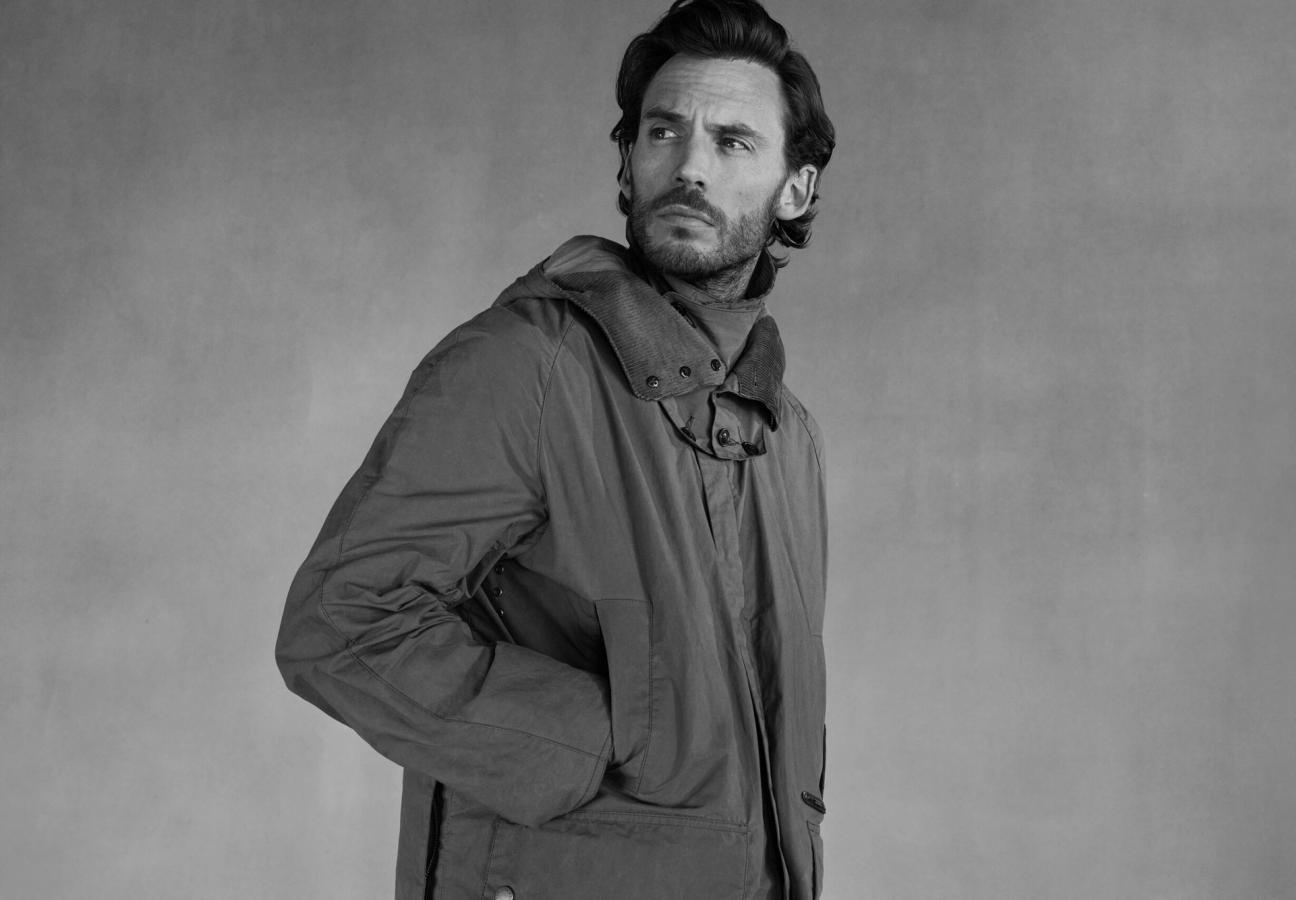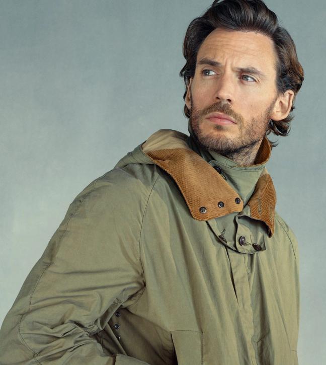 Claflin wears Barbour Gold Standard Overdyed Corbridge Jacket