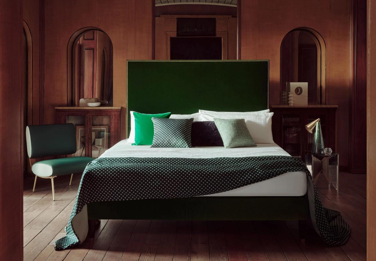Like a capsule wardrobe – or a collection of any lifestyle essentials, for that matter – we’d always recommend starting from the baseline and creating a solid foundation from which you can build on. The Harlech headboard, most notably, is a fine place to begin, due to its duality: upholstered in velvet Rubelli Donghia in ‘Hunter’ green, and finished with polished-brass nailing and Georgian-style legs with brass caps, it is a subtly opulent, regal design, but its slender, regular profile also allows it to act as a neutral backdrop from which you can spotlight more elaborate fabrics and patterns.