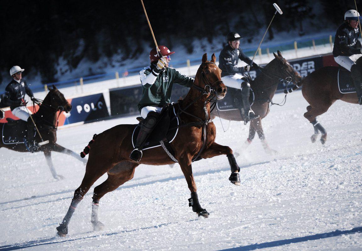 Across the field — kitted out in black — the dark knights of the Maserati team are sitting atop their steeds, sticks up high like lances. Their horses have long game faces on, and have been fitted with specially adapted studded Alpine shoes.