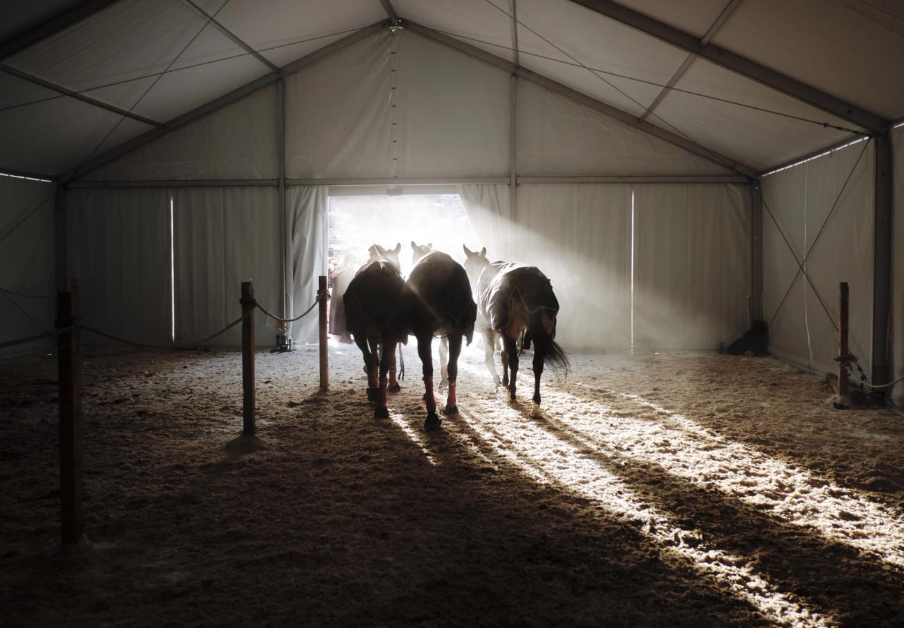 The ponies are the thoroughbred stars of this wintry spectacle. Four have red bandages tied tightly around their legs and padded saddle blankets quilted in the same colour — each lavishly embroidered with ‘Cartier’ in snow white script.