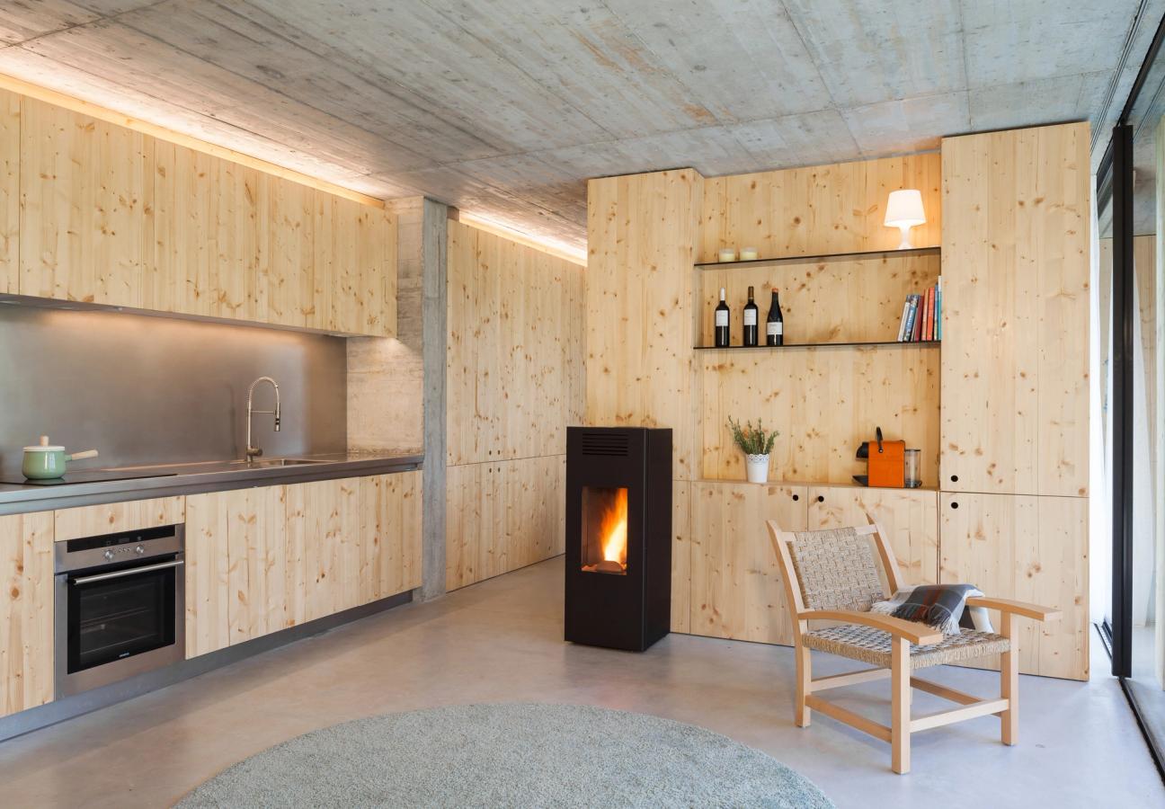 This block is made of up of one single open-plan space encompassing a living, dining and resting room. The Retina House also features a small swimming pool and large wooden blinds that open to give a sweeping view across the Santa Pau landscape.