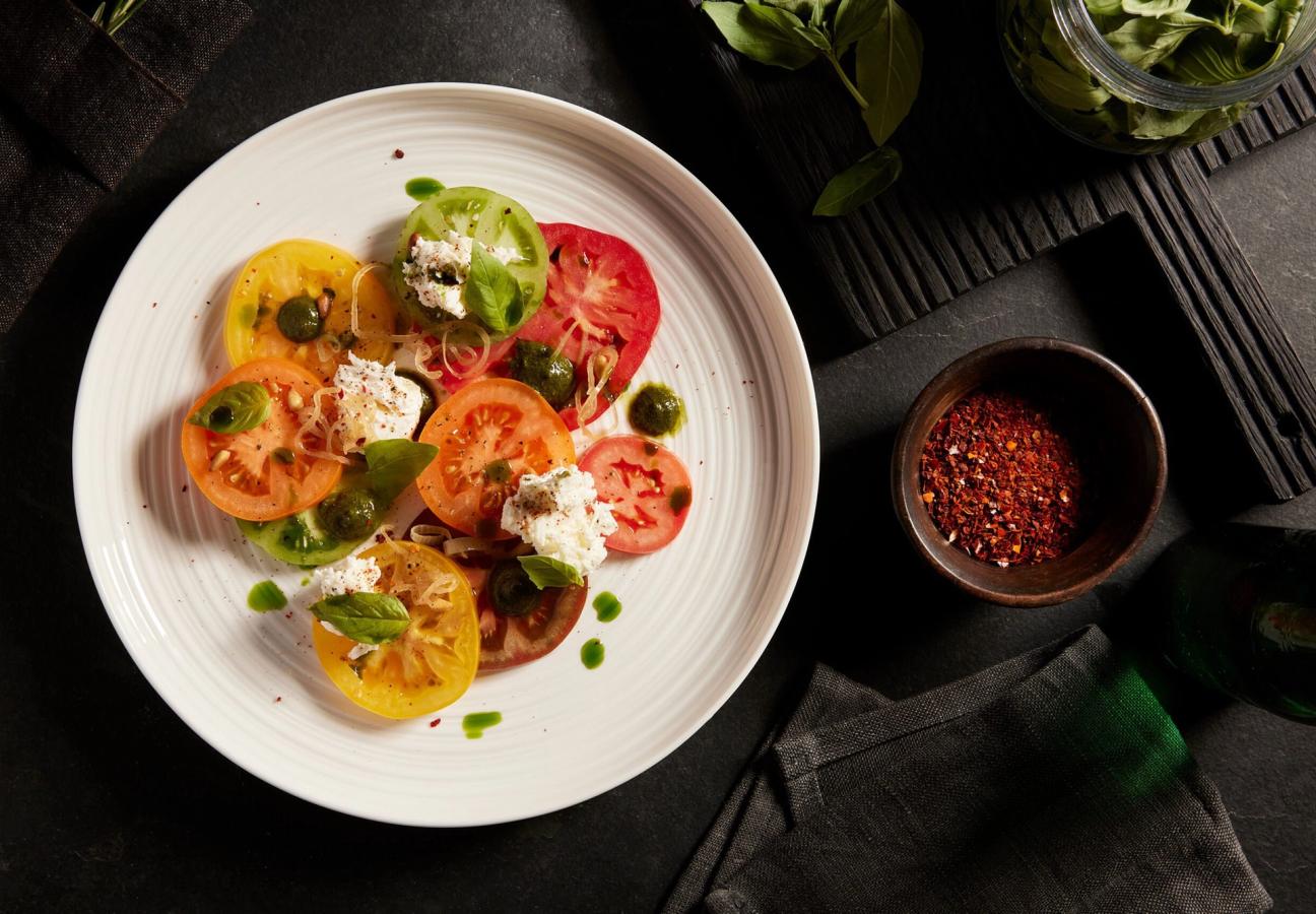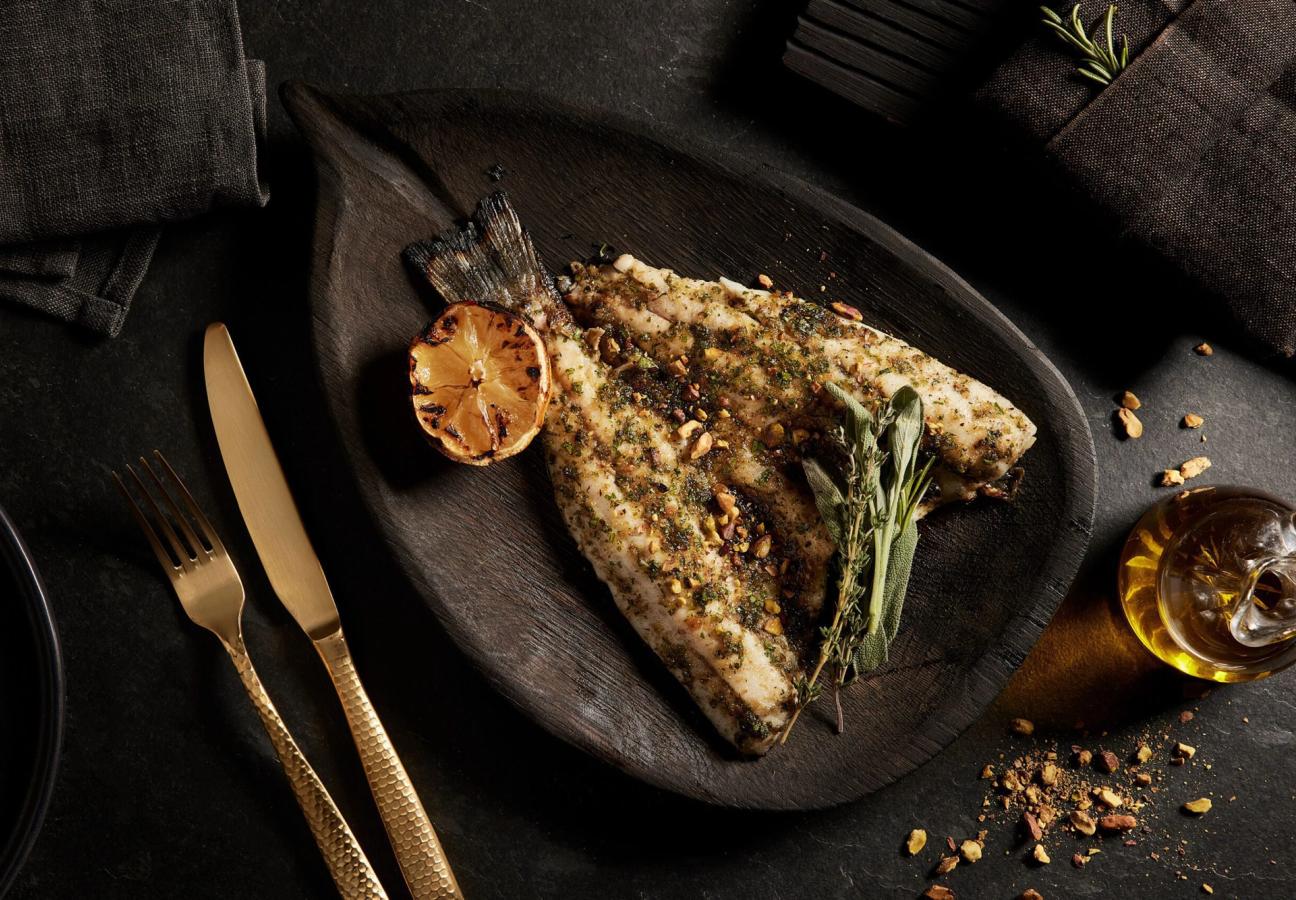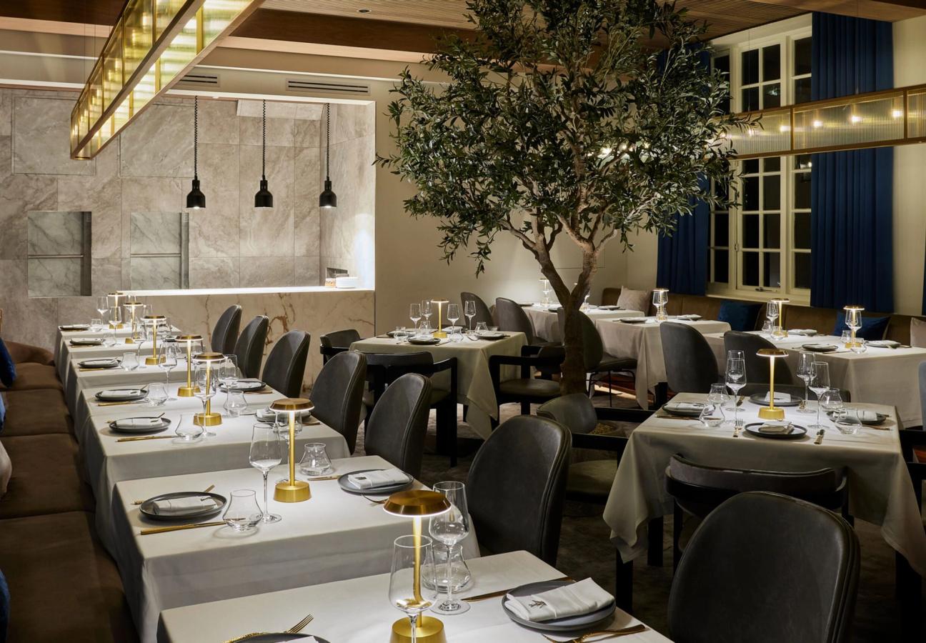 Across the sizeable, multi-level space, so large it could likely host a couple of tennis matches inside, there’s a ground-floor brasserie that leads up to a terrace dining room, a parlour eaterie on the second floor, and a cigar lounge at the top. The interiors, done out with hallmarks of classic Italian and Med aesthetics – huge stretches of neutral tones with blue and emerald flourishes, hits of marble and wood, and massive planted olive trees, with illumination from contemporary lighting that hangs above – are a medley of parts that simultaneously speak of refined south-European fine-diners, but also of the polished, special-occasion establishments that continue to uphold culinary standards on the west coast.