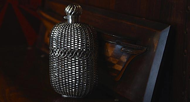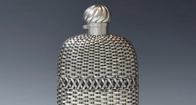 Hip flasks come in a variety of styles and were traditionally made of silver. Glass examples, which do not taint the taste of the alcohol, are clad in leather or crocodile skin for protection and often have gilt-lined silver beakers to form the base. Bentleys have a rare and impressive flask made by the American Silversmiths, The Gorham Silver Company in 1900 (illustrated). The silver is woven as fine basket-weave and the flask is finished with a spiral fluted stopper and costs £3,900.