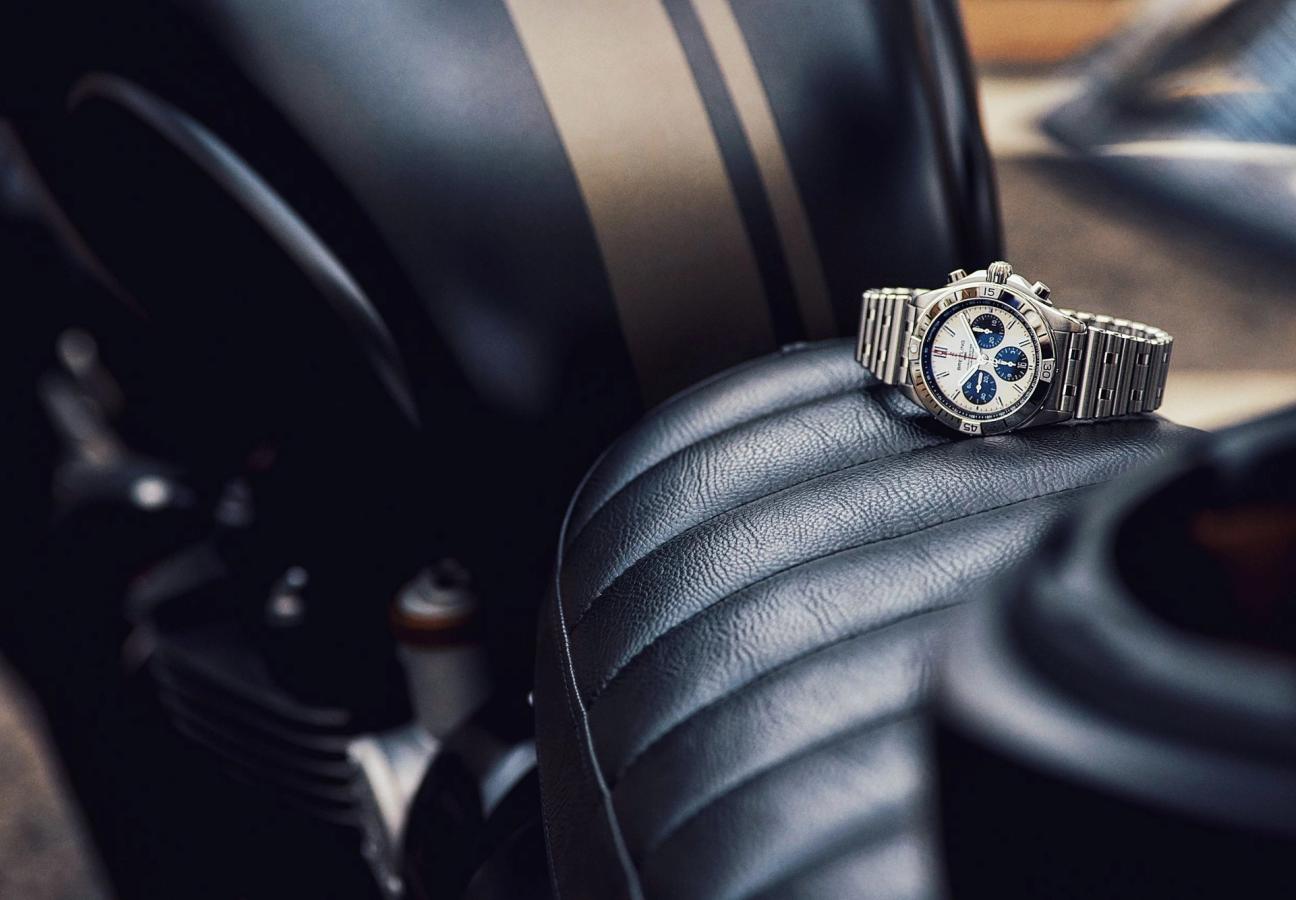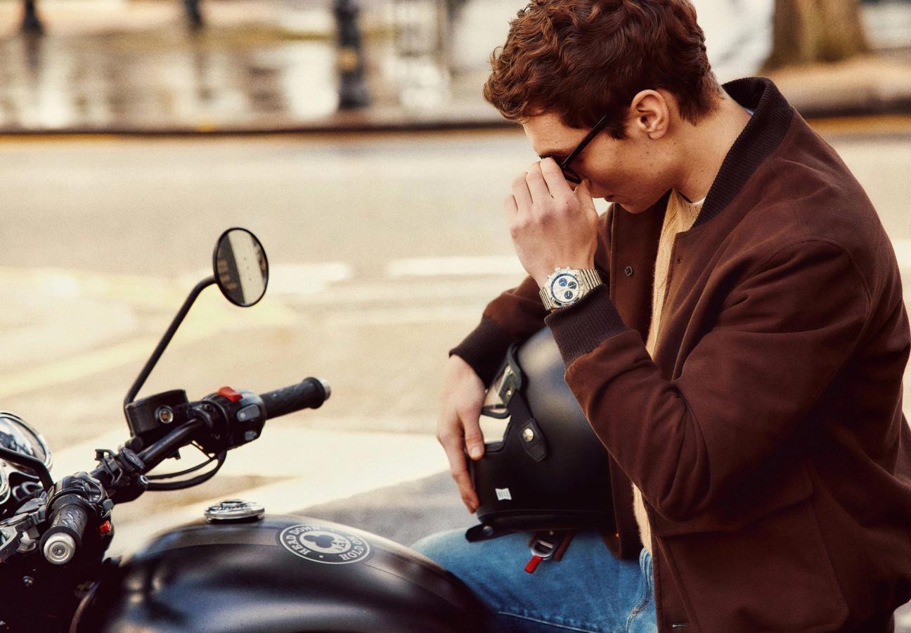 Breitling Chronomat B01 42, £6,650; Connolly navy cashmere blouson, £1,950; Ralph Lauren Cashmere jumper, £395; Sunspel classic cotton t-shirt, £70; Curry & Paxton Alex sunglasses, £149