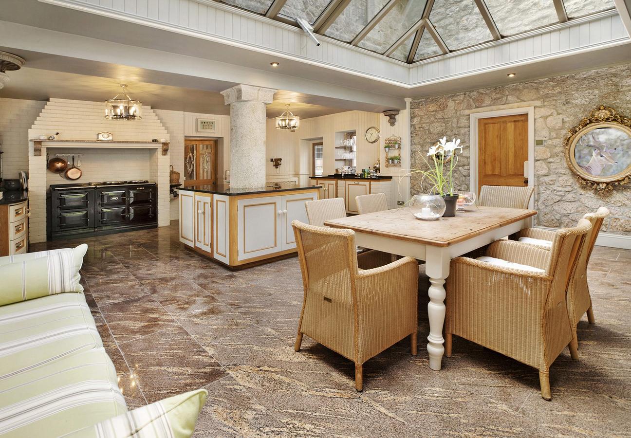 At the rear of the house, the new owners will find the grand kitchen and breakfast room — where cabinets hewn from bespoke oak and a central island crafted around a bespoke granite pillar blend in seamlessly with the exposed stonework. A glass roof offers plenty of light, and the five-oven AGA gives plenty of scope for long, decadent Sunday lunches.