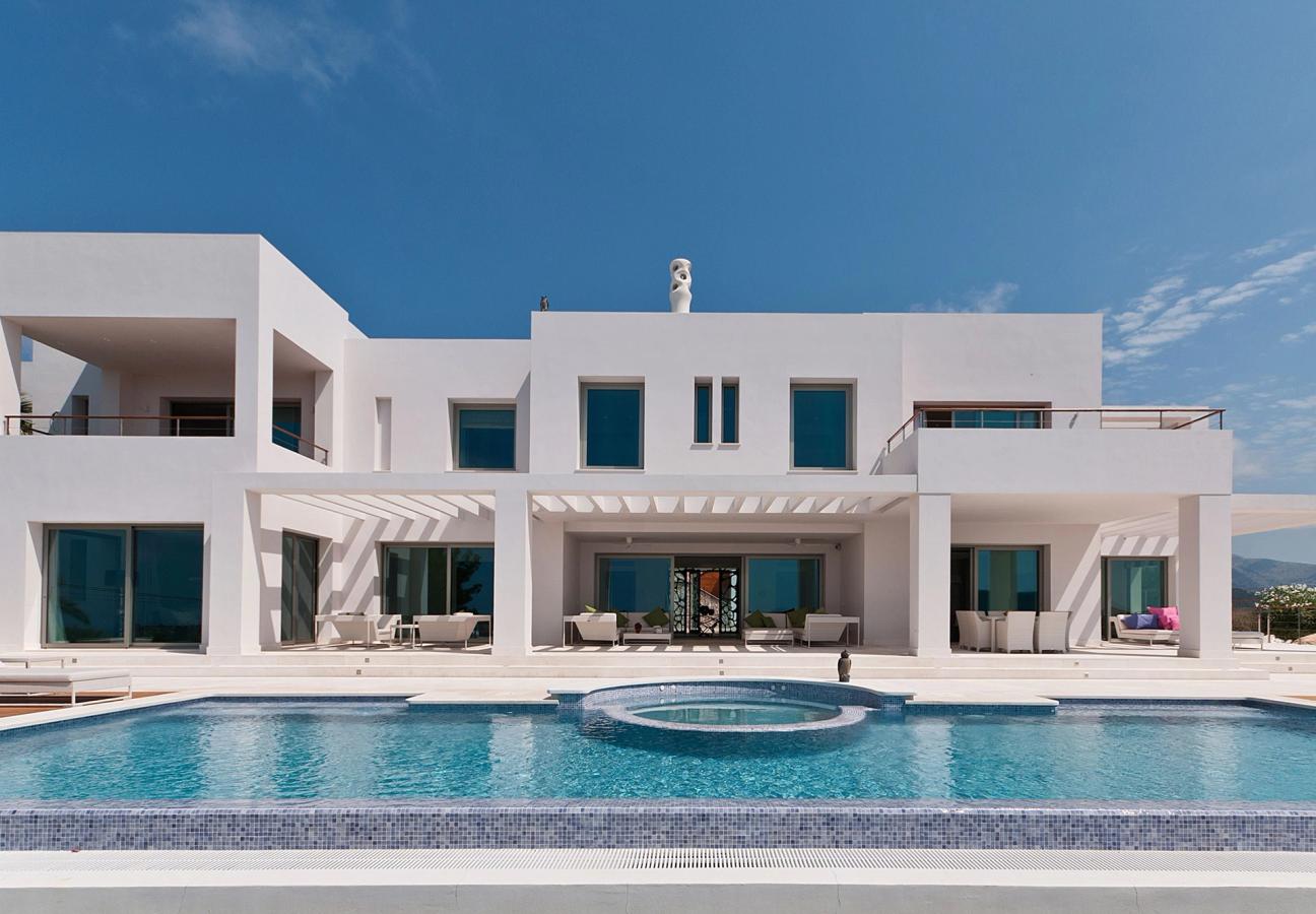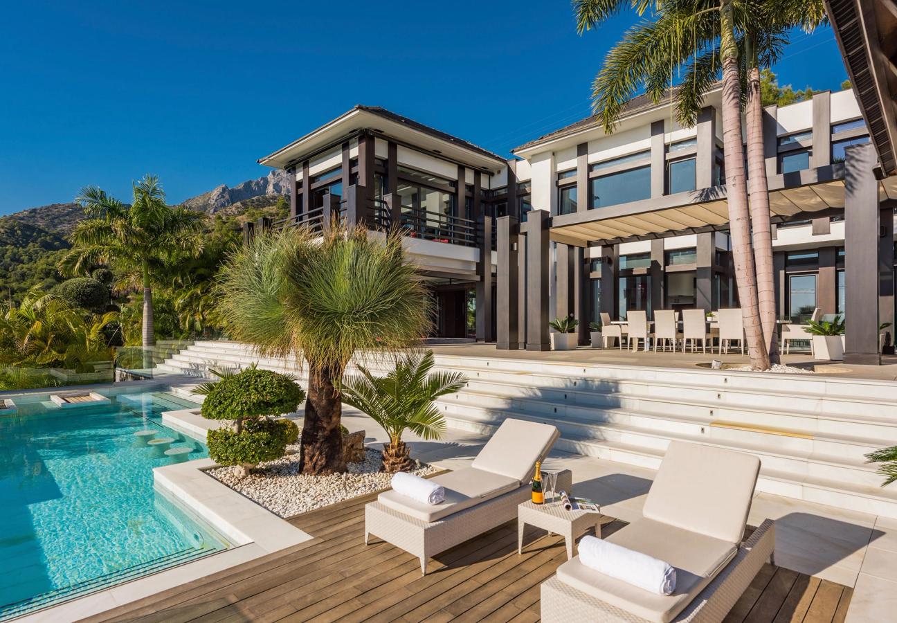 Located in Marbella’s famous Golden Mile this contemporary Spanish villa offers sea and mountain views from the two private marble swimming pools. Offering a perfect location to host a summer party with eight bedrooms and a guest duplex apartment.
