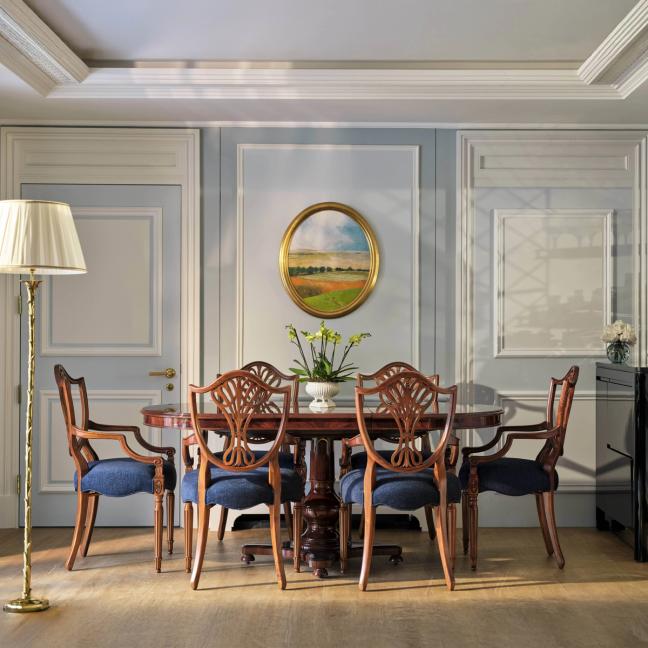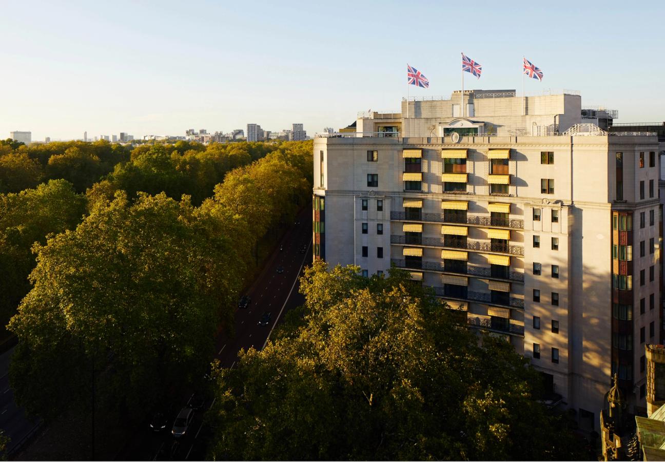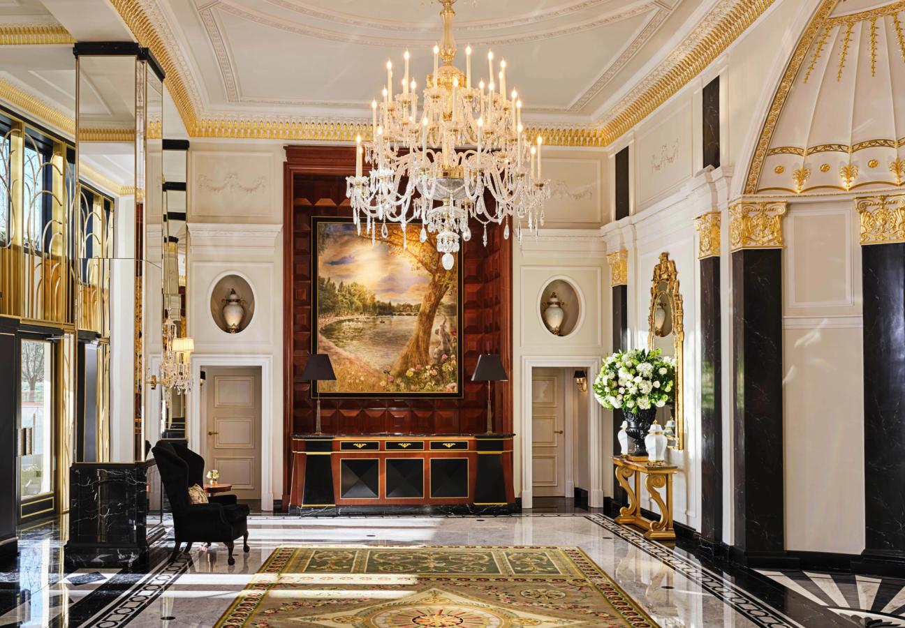 In the floors above are the elaborate webs of corridors and guest rooms: there’s the light, floral scheme of the Dorchester Studio; the Belgravia Suite, dressed like a lush stretch of Hyde Park opposite, offers a look on to the armada of supercars that pull up to the front entrance; and with the Hyde Park Suite, perhaps the draw of the moment, you get the feeling that you’ve stepped inside a bit of Wedgwood tableware, with the room’s interiors blasted with a Pantone book of blues. It is in the latter pad where you get the perfect London view – not of the palace, or the skyrise, but of a long line of park trees – a floorplan that can easily host a quick five-a-side session, and tables sizeable enough to play a few late-night card games.