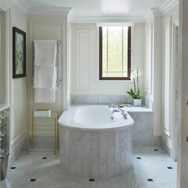 The moment you drag your suitcase through the revolving door, the effect is almost Oz-like, with the monotone of reality fading into a lush blaze of life: a lobby large enough to fly a kite in; the elegant flow of sharply tailored staff; a seemingly choreographed movement of drinks trays and bellhops and guests on their way to dinner. And at The Promenade – the hotel’s suave heartbeat – designer Pierre-Yves Rochon has scoured out the previous scheme and loaded the space with statement rugs; unsparing splashes of yellow, pink and blue; glittering gold trims; important artwork; and seating that brings to mind the Marie Antoinette aesthetic.
