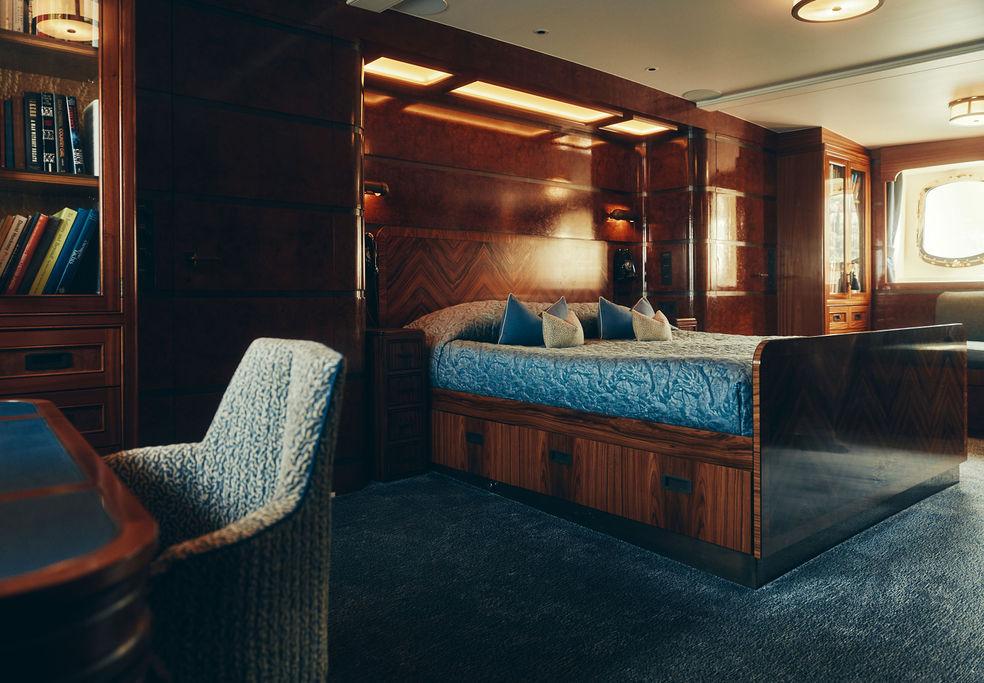 Continuing the ‘made in Britain,’ theme throughout, London-based designer Guy Oliver was commissioned to oversee the interior re-fit, given his experience with the Connaught hotel, Claridge’s and the state rooms at Number 10 Downing Street. Oliver took on the six cabins and communal spaces but the devil lies in the detail. No less than 10 original 1930s Bakelite phones were installed, along with 122 custom overhead art-deco lights made from 1930s materials.