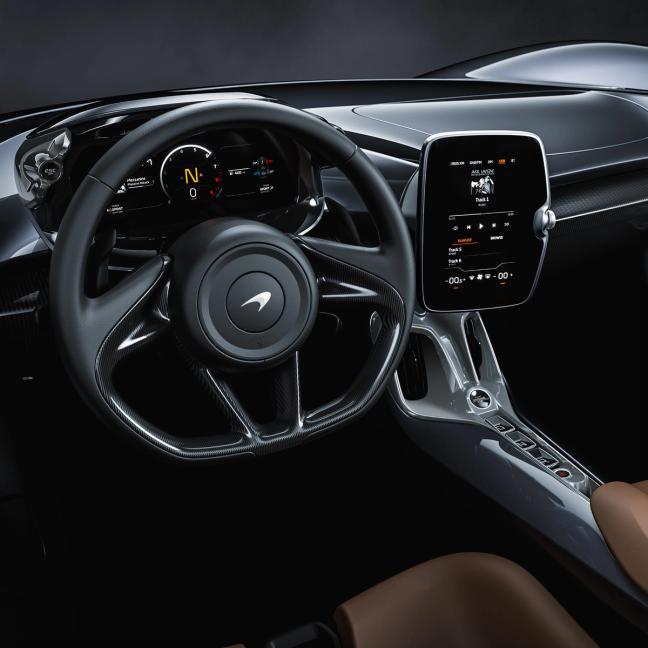 Inside the cockpit-cum-cocoon, a spar of carbon fibre runs between both driver, passenger and the two bespoke seats, themselves complete with six-point race harnesses. A centrally-mounted 8-inch high-resolution display errs on the right side of big, and features including satellite navigation, McLaren Track Telemetry, rear-view camera and climate control can be controlled through this touchscreen.