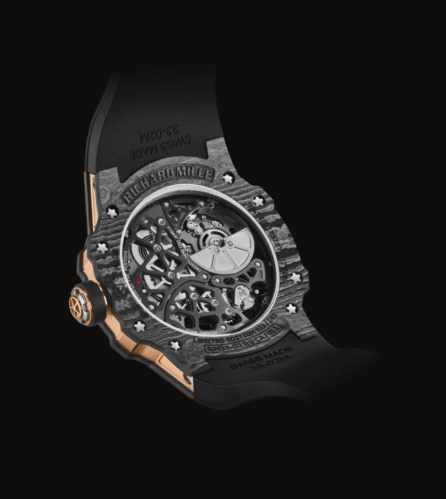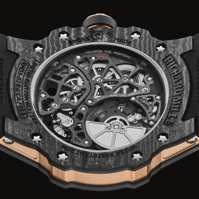 Firstly, let’s talk about those materials. Although they may not be cast in iridescent green or incandescent orange, each individual component you can see on the RM 33-02 is fashioned from materials that sounds straight out of sci-fi. Those bridges? Black PVD-coated Grade 5 titanium. That skeletonised baseplate? Treated with Titalyt. Both front and back bezels? Carbon TPT.
