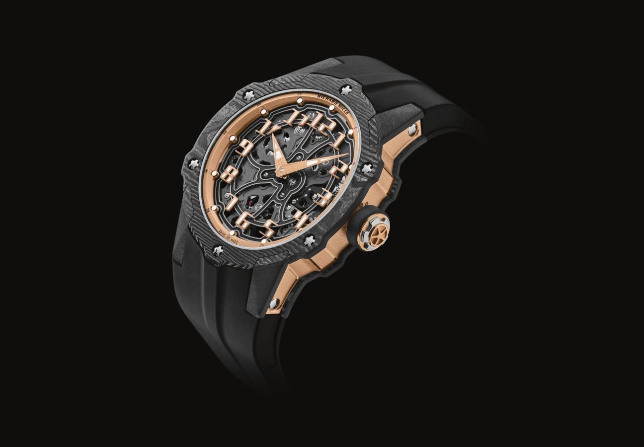 In fact, the innovative Carbon TPT — a material created by layering hundreds of sheets of carbon fibre together to change the orientation of the weft between layers — is a perfect metaphor for Richard Mille’s latest. To look at it, you wouldn’t think that this case had been heated to 120°C and machined in the same manner as aeronautic components. And yet it has. This is a new breed of understated Richard Mille; at once unassuming and tremendously impressive.