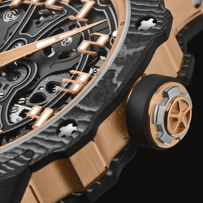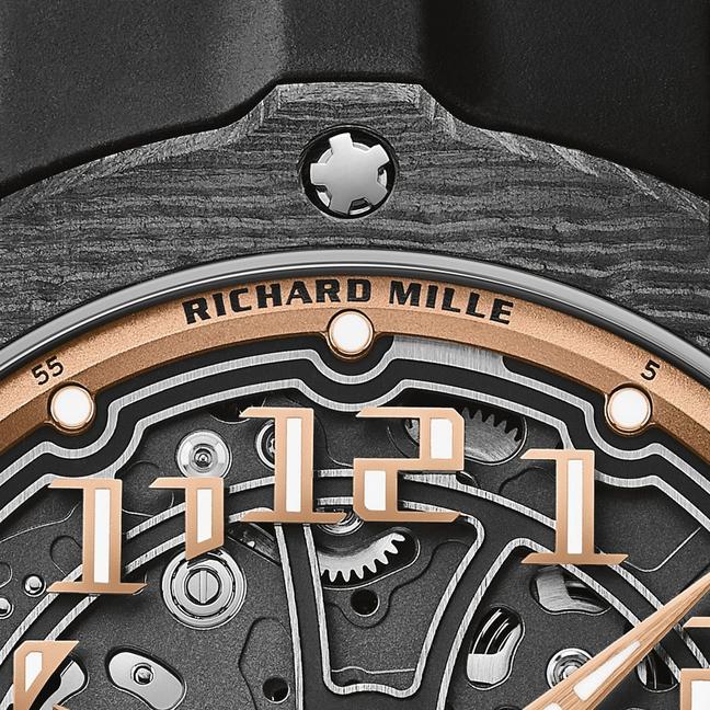 All that meticulous watchmaking is fronted by a titanium dial, itself boasting numerals created from solid metal, sculpted and mounted on two linked, rigid titanium rails. It is this ‘mask’ that affords the RM 33-02 its dress code-spanning style; marrying the performance of a sports watch with the opposing elegance of a round timepiece.