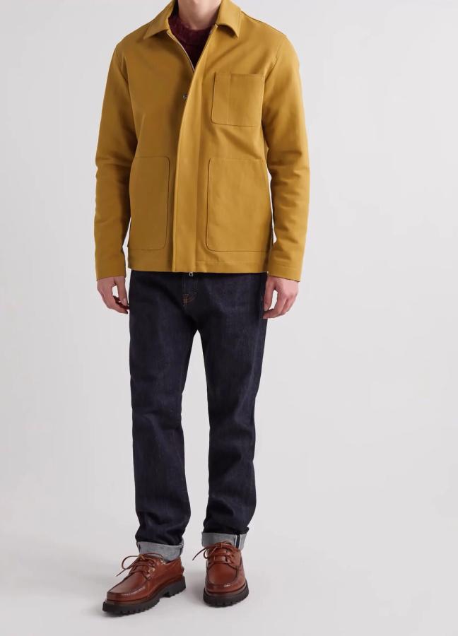 So how to deploy it? We’d throw it on in bold blocks. That could mean it forms the base of your outfit, such as Drake’s crew neck cotton sweatshirt, or it might mean a pop of ankle-level, eye-catching colour courtesy of New & Lingwood‘s punchy socks, but it pays to put this saturated shade to striking use. Our favourite option? This classic, cargo-inspired workers jacket from Mr P. — light enough for spring; bright enough for summer.