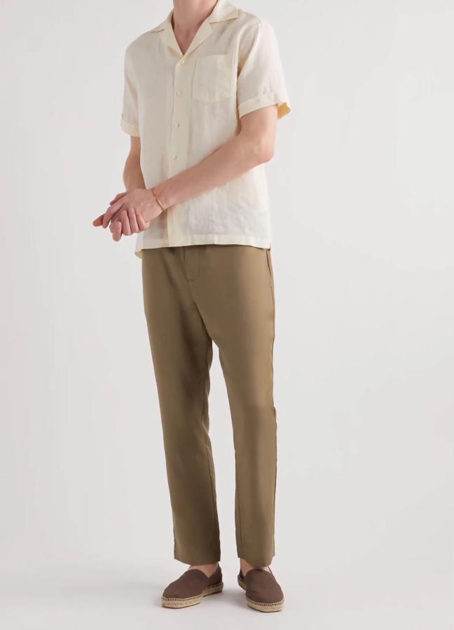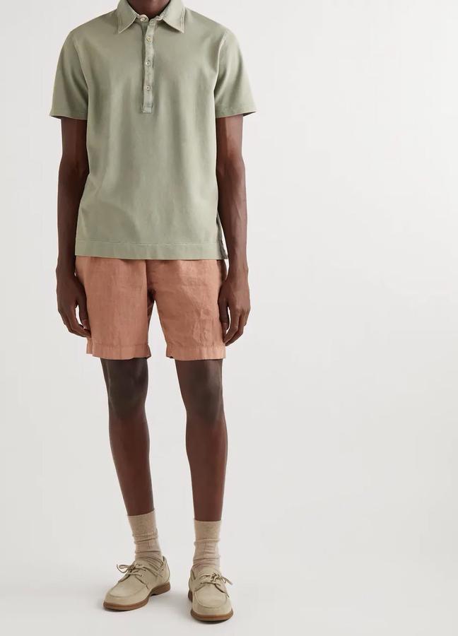 From Love Brand & Co, this ‘Andros’ shirt is a lustrous olive colour and created using hemp — a material that’s not only lightweight and breathable, but also has four times the tensile strength of cotton. Hartford’s ‘Troy’ trousers are slightly softer; cut from linen, but still walking that pale green line in a shade of sage. Or, for the lightest of light greens, go for Boglioli’s cotton-piqué polo — casually cut and finished with mother-of-pearl buttons.