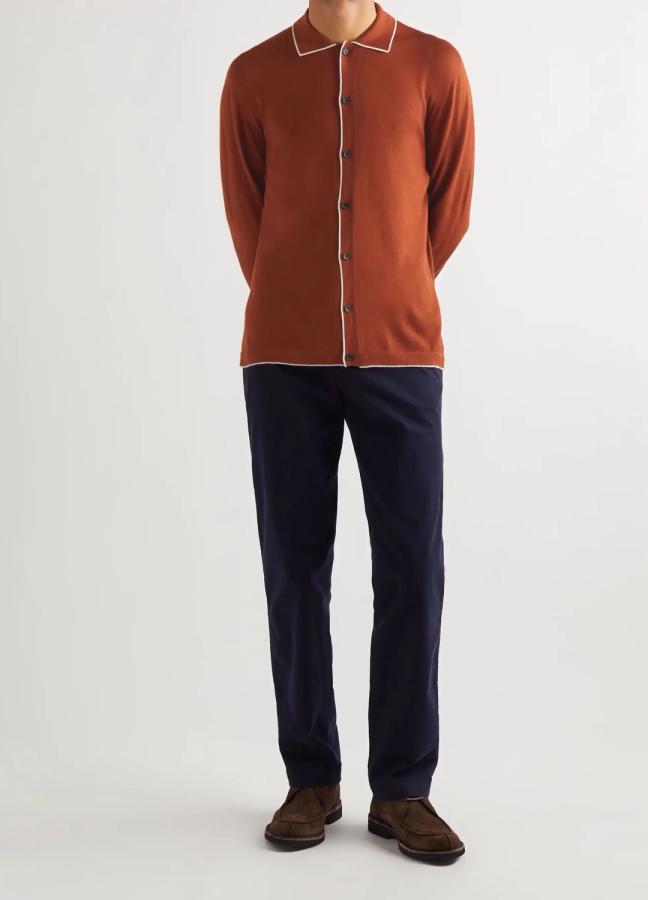 It’s such a rich colour that we’d suggest finding some choice knitwear in sunset orange; pieces with a deeper pile and softer handle than your usual warm weather clothes. Rag & Bone has spun a ribbed crewneck from cashmere, and Mr P. has gone even softer — with a silk-blend, contrast-tipped knitted polo shirt. But our choicest piece of sunset orange kit is this leather-trimmed tote from Ralph Lauren; bold and brilliantly practical.