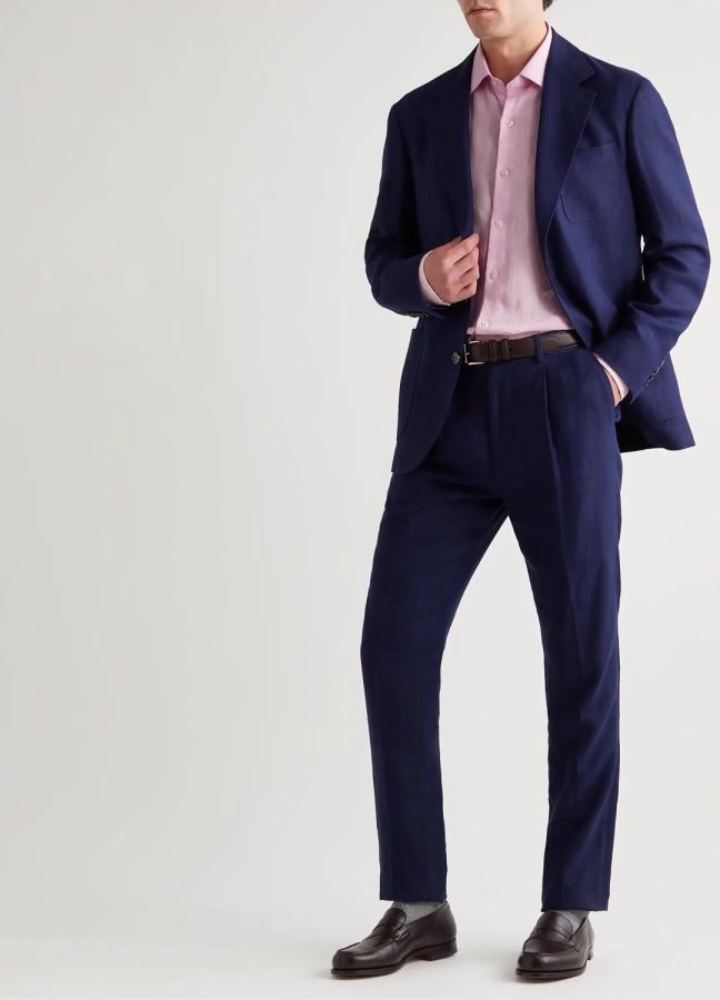 That means, if you do wear a pink shirt with your suit, forgo the tie. Look at Emma Willis’ superior option below; with a hem so gently curved it’ll even work untucked on the weekend. Hemingsworth once again corner the swim short market with these softly striped ‘Clipper’ trunks — and Luca Faloni’s ‘Siena’ shirt has a light washed effect; coloured peach using a traditional garment-dying process called ‘tinto capo’.