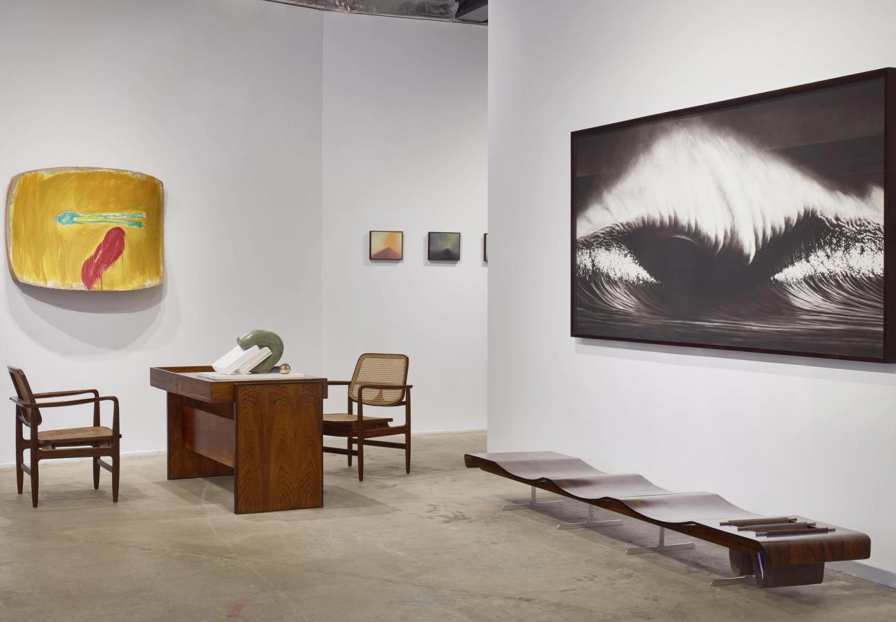 “Funnily enough I had people coming in yesterday, and for the first time they seemed more interested in the design than the art,” Van Hagen says, and the eye is certainly first drawn by a polished wood desk and cane-backed brazilian chairs, from which one could probably right a quite brilliant novella. Above these sits a dominating black and white charcoal piece by Robert Longo of a glittering, cresting wave, while a minimalist Sol Lewitt sculpture sprawls across the floor. But as you walk around the space, the smaller, quieter details make themselves heard, too — fine, understated ceramics; a selection of Poppy Jones watercolours on silk and suede canvases. As we stroll around, Van Hagen peppers his speech with a refrain of ‘very cool, huh?’. Chic, laidback and inviting, that might well have been the subtitle for this brilliant new collection.