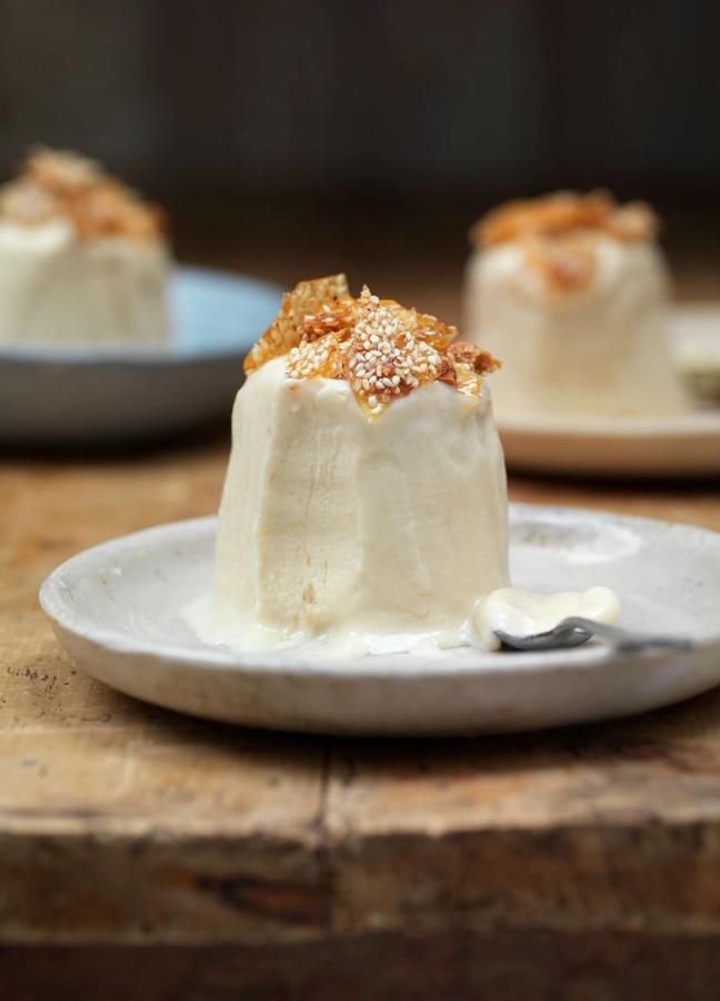 - To loosen the kulfi from the moulds, dip the bottoms of them briefly into hot water, run a knife carefully round the edge of the mould and turn out onto a plate. Top with the shards of sesame brittle, and serve.
