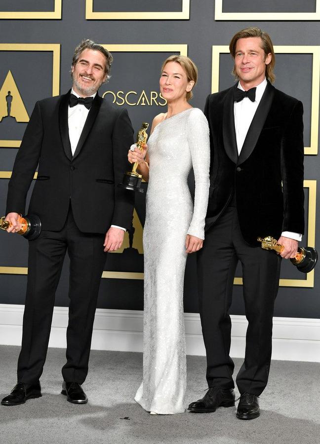 Another iconic team, three of the top winners of the night also wore traditional black tie, with Joaquin Phoenix still slipping into the Stella McCartney tux he’s been wearing all season. We’re particularly taken by Brad Pitt’s choice; a Brioni velvet shawl-necked dinner jacket.