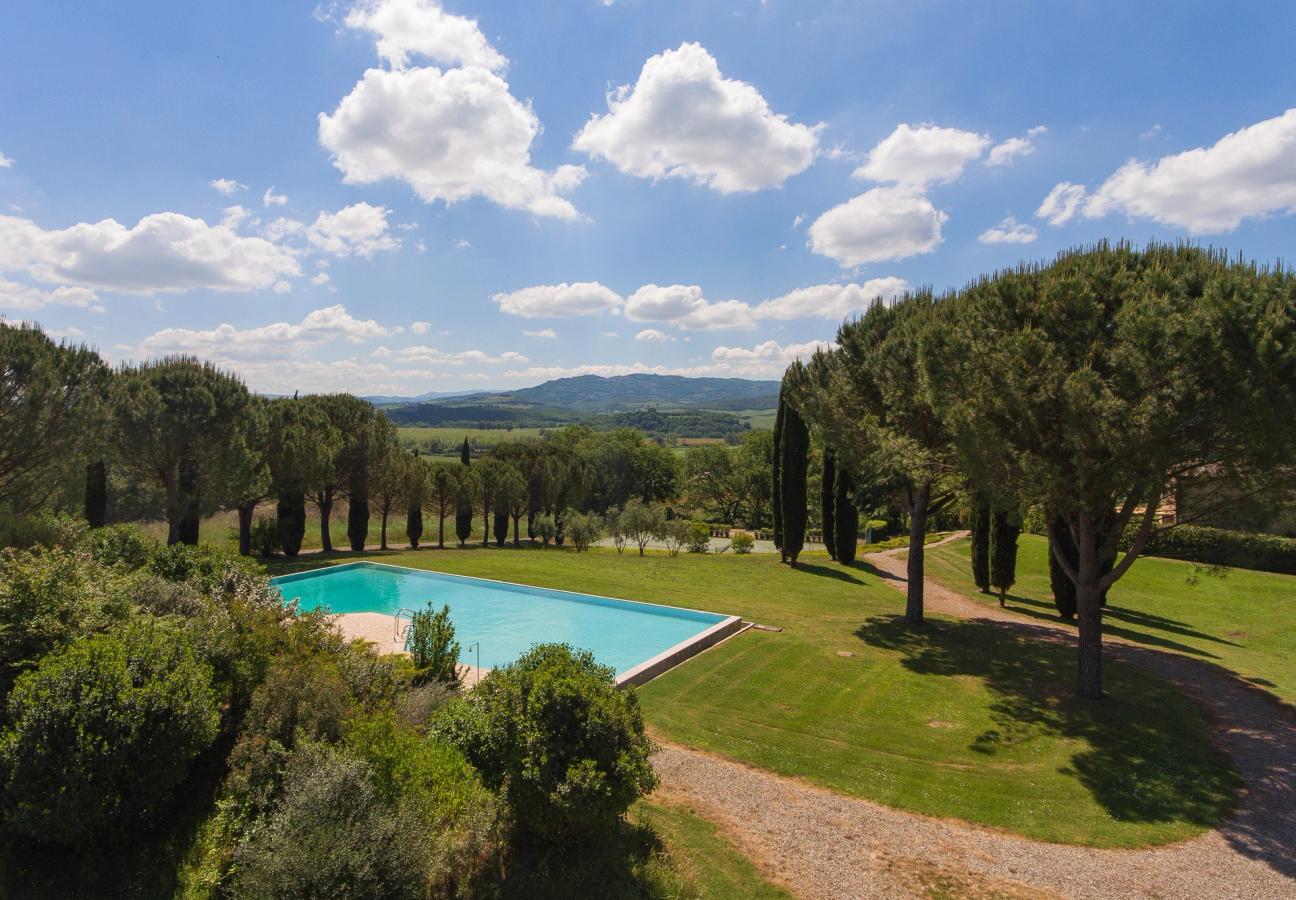 It sits in the heart of the Tuscan countryside, boasting a private garden featuring a fully-managed pool and tennis court. Inside, the decor offers barrel-vaulted ceilings throughout, open fireplaces and a great selection of tapestries on the walls.